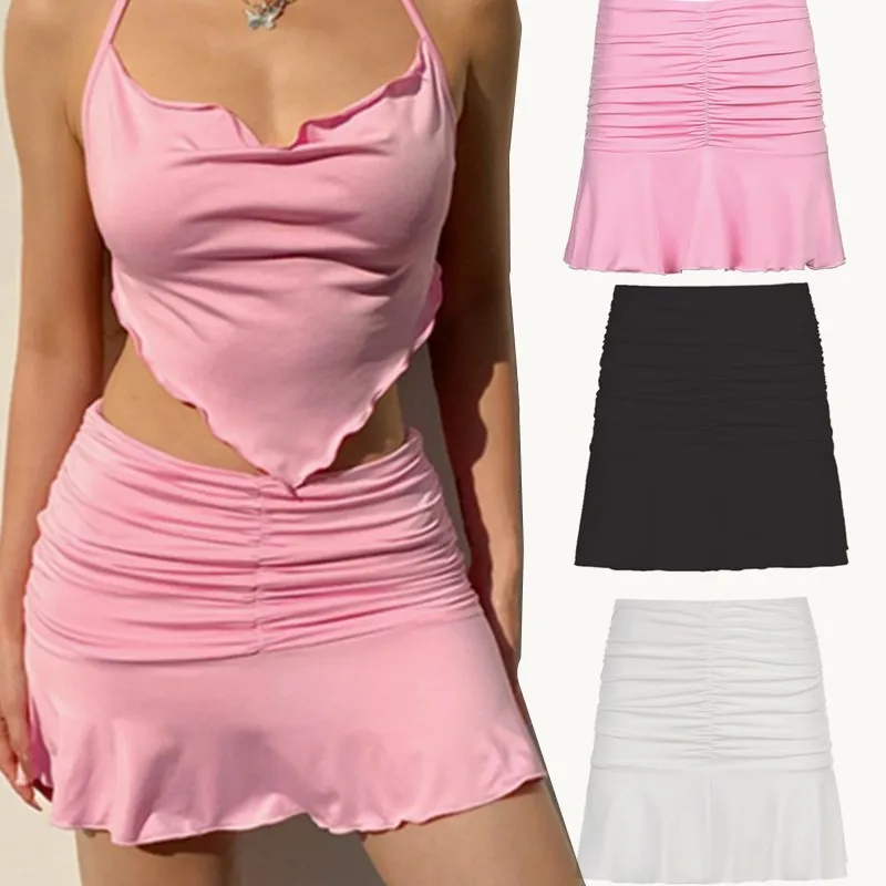 Женская юбка с оборками, сексуальные кавайные юбки, летние тянущиеся однотонные облегающие мини-юбки Y2K в стиле ретро 90-х, модная Милая Мини-юбка