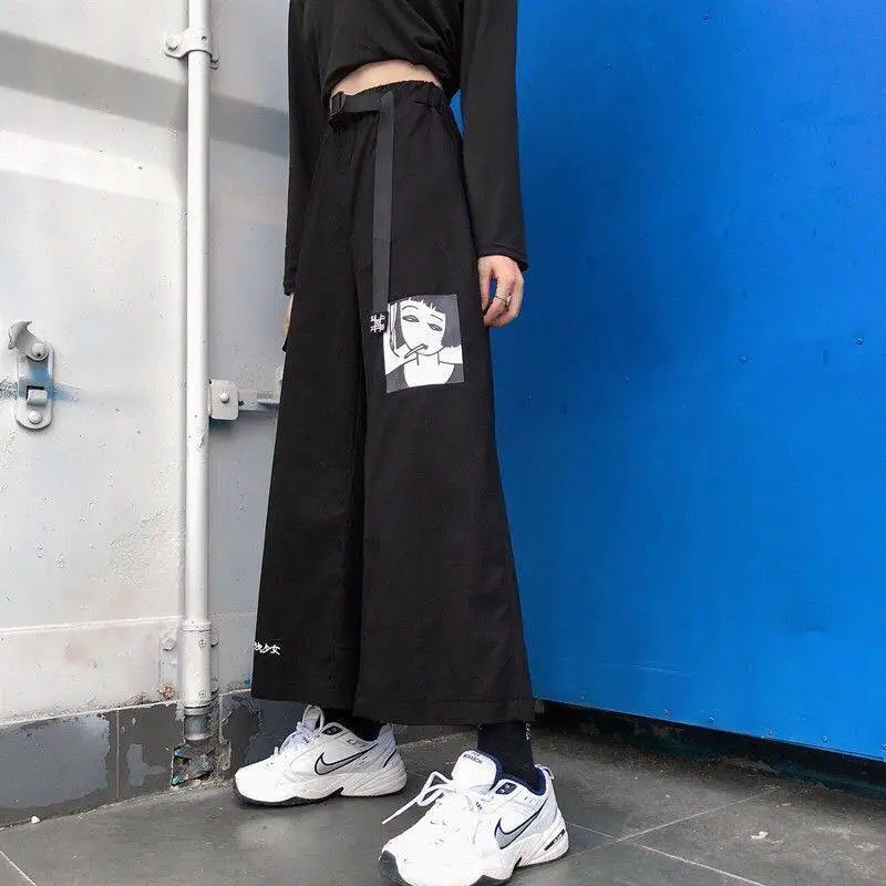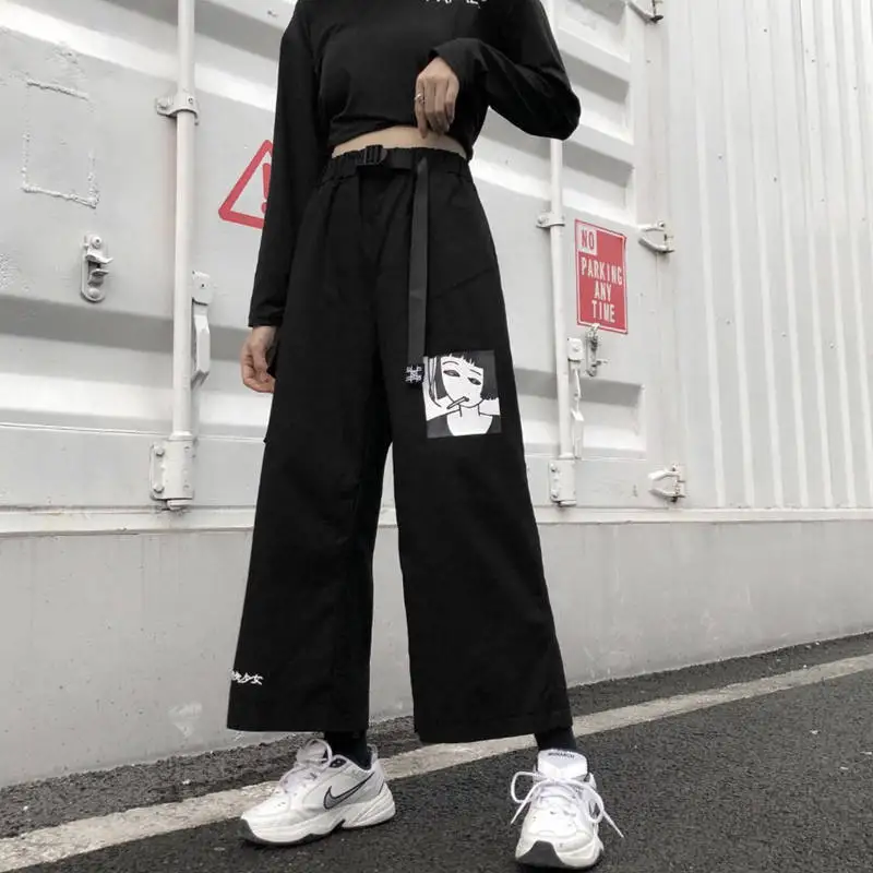Брюки-джоггеры в стиле ретро Harajuku Y2K, модные штаны в стиле оверсайз с широкими штанинами, с завышенной талией, с аниме принтом, в стиле 90-х, женские мешковатые штаны с поясом