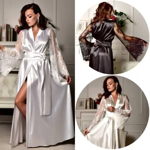 Халат-кимоно Женский Шелковый атласный, пикантная одежда с цветочным кружевом и длинным рукавом, свадебная одежда для сна и подружки невесты, осень 2018