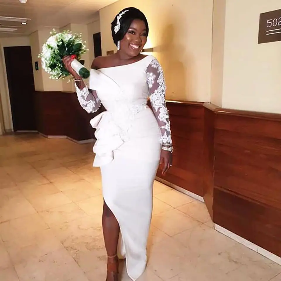Платье подружки невесты с юбкой-годе, Белый эластичный атласный вечерний наряд с длинным рукавом, кружевной аппликацией, до бедра