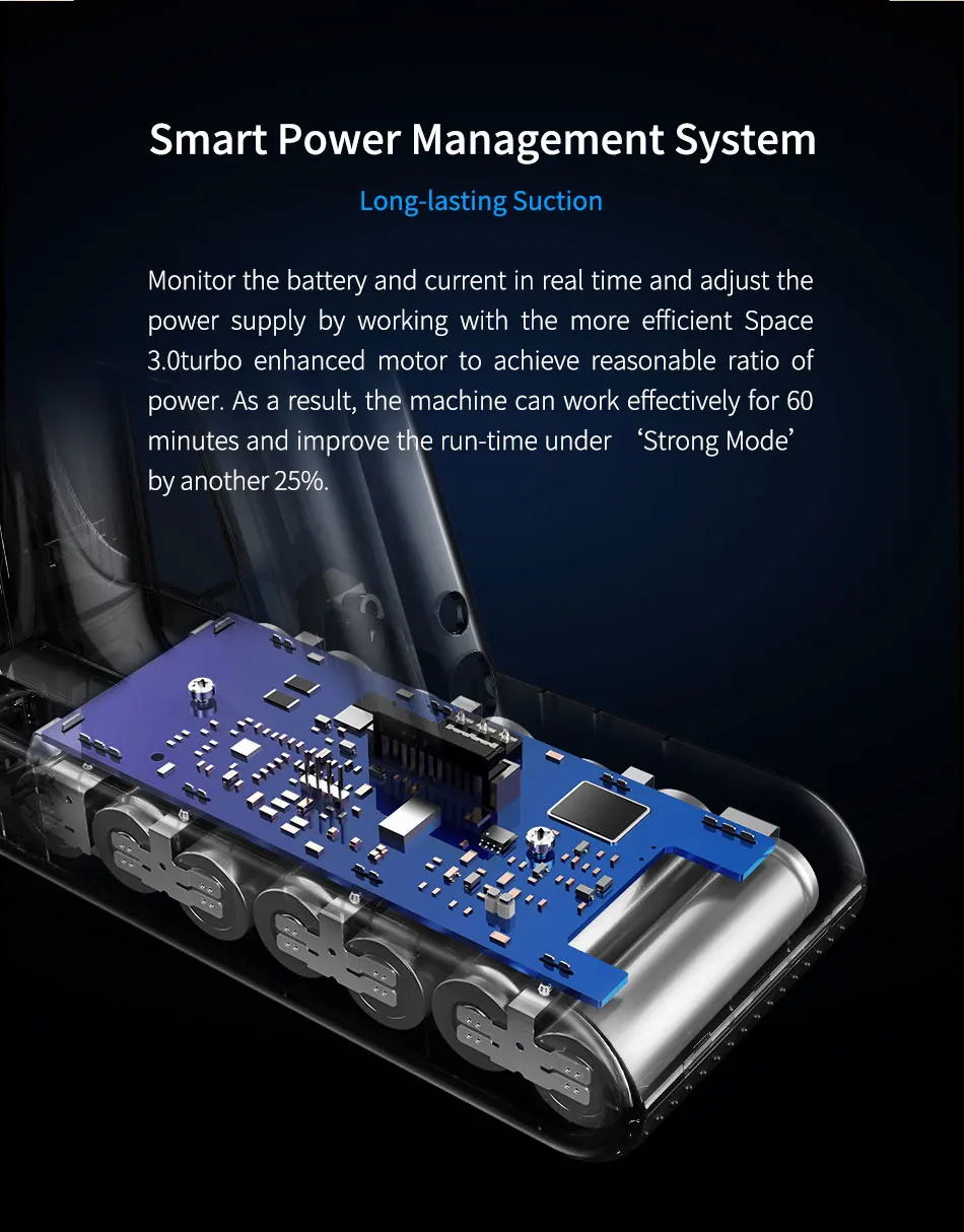 Контролируйте батарею и ток в режиме реального времени и регулируйте источник питания, работая с более эффективным двигателем Space3.0 Turbo enhanced для достижения разумной мощности. В результате машина может эффективно работать в течение 60 минут и улучшить время работы в сильном режиме на другой 25%