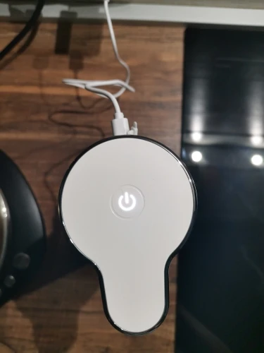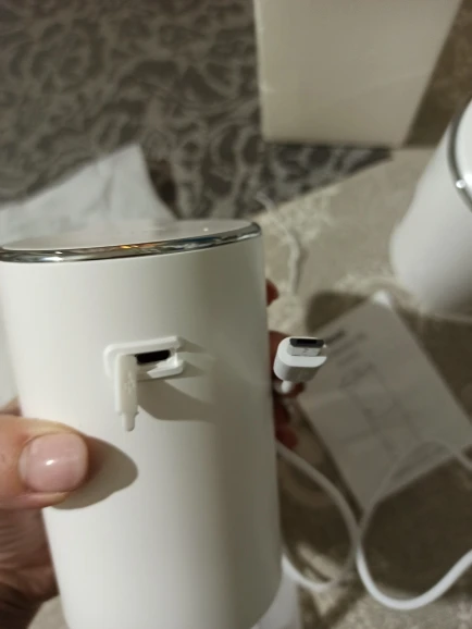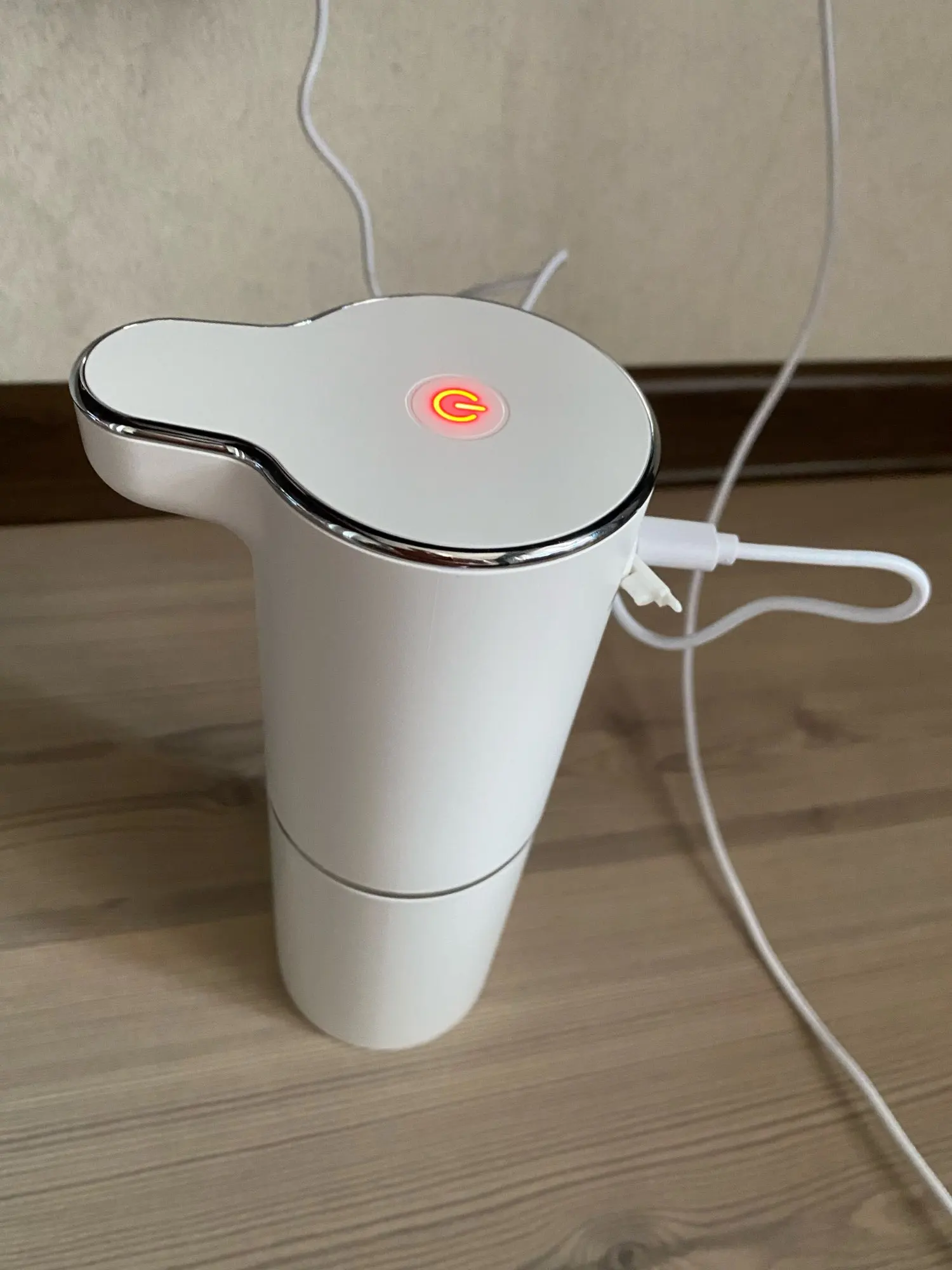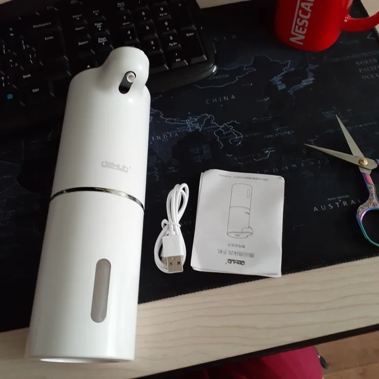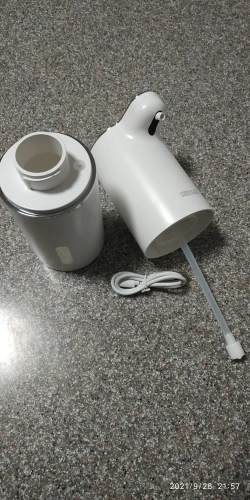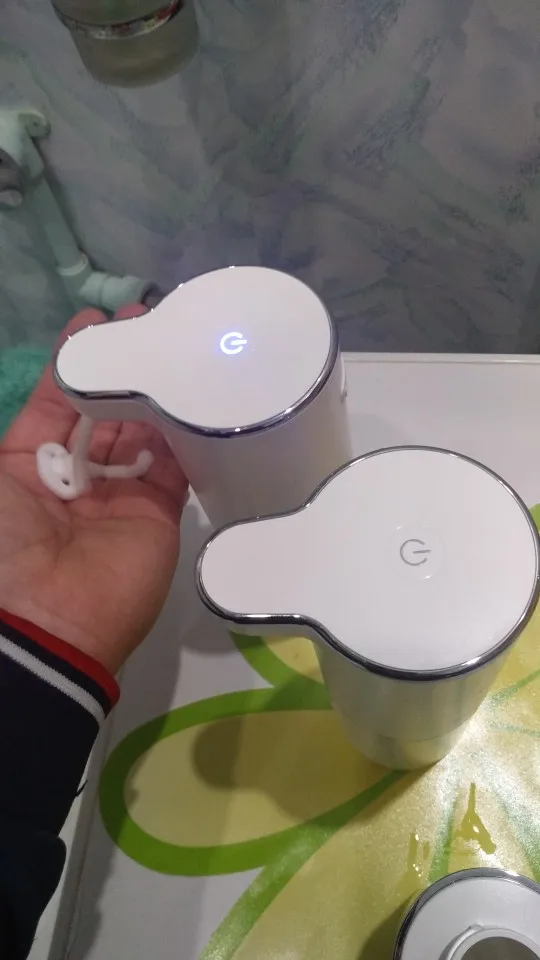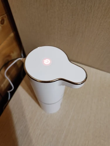 Очень понравился этот умный гаджет! В комплекте маленький USB - провод для зарядки. Мыло развела в пропорции 100 мл мыла + 200 мл воды - пена густая, ее много!