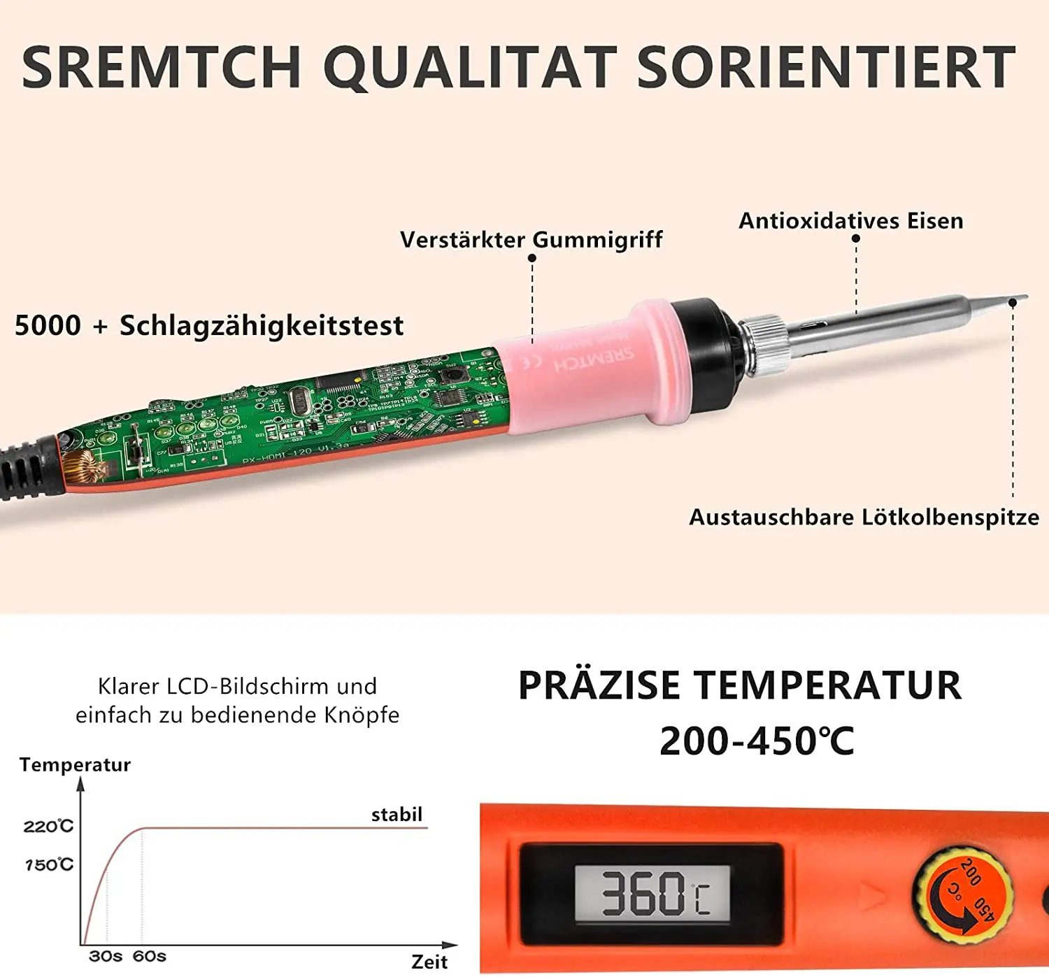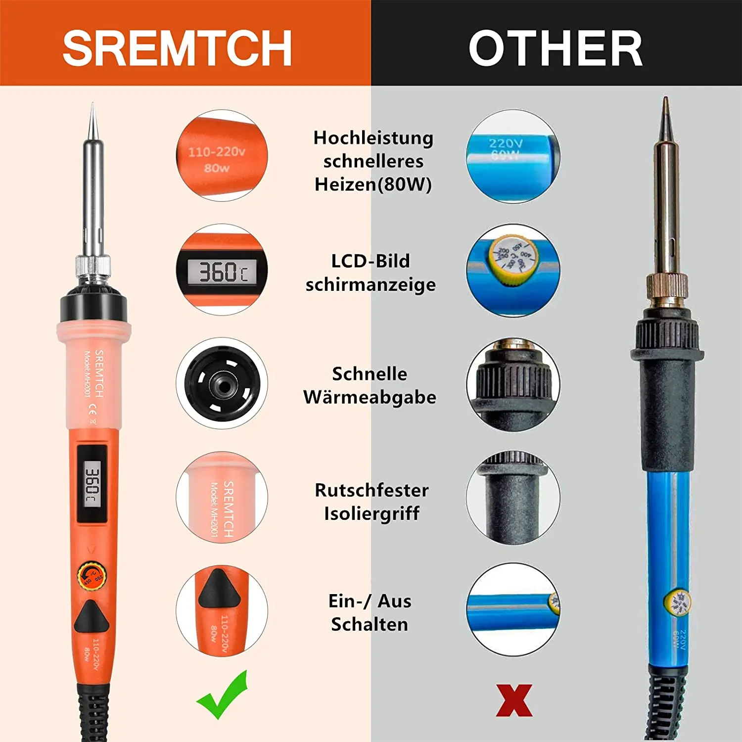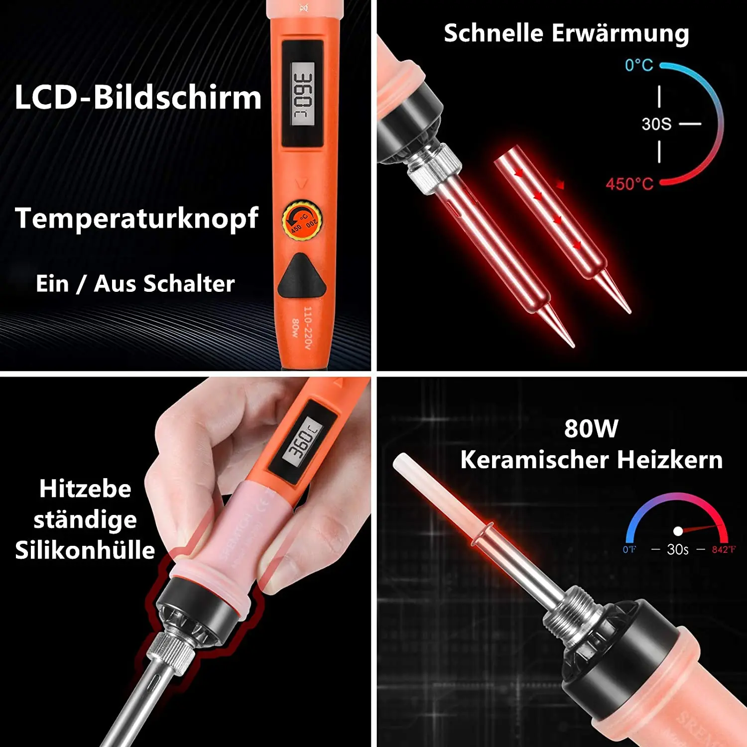 【 ЖК-цифровой электронный паяльник 】паяльник с ЖК-дисплеем высокой четкости, который более четко показывает статус температуры. С регулятором температуры на электронном паяльнике, вы можете регулировать температуру от 200 ℃ - 450 ℃.[Эксклюзивный патент] четыре вентиляционных отверстия на наконечнике припоя и четыре вентиляционных отверстия на трубе обеспечивают лучшую теплоотдачу, чем другие. Потребление энергии ниже, чем обычный паяльник, который является более энергоэффективным и экологически безопасной.【Высокомощный нагревательный элемент 】 паяльник мощностью 80 Вт быстро нагревается благодаря технологии внутреннего нагрева керамики, высокой термостойкости, может защитить ваши сварочные предметы.【Прочный в использовании 】превосходный Профессиональный паяльник имеет 5 нескольких подсказок для замены, которые стойкие к окислению, и он не будет легко ржаветь во время погружения в воду.【Widely Used】The паяльник существующие международные платежные инструменты хороший выбор для плата сварочной цепи, для домашнего использования, хоббитов, ремонт мелкой бытовой техники, ювелирные изделия, сварочные. Это легко использоваться вне зависимости от того электроника для хобби или начинающих изучение электронной техники.