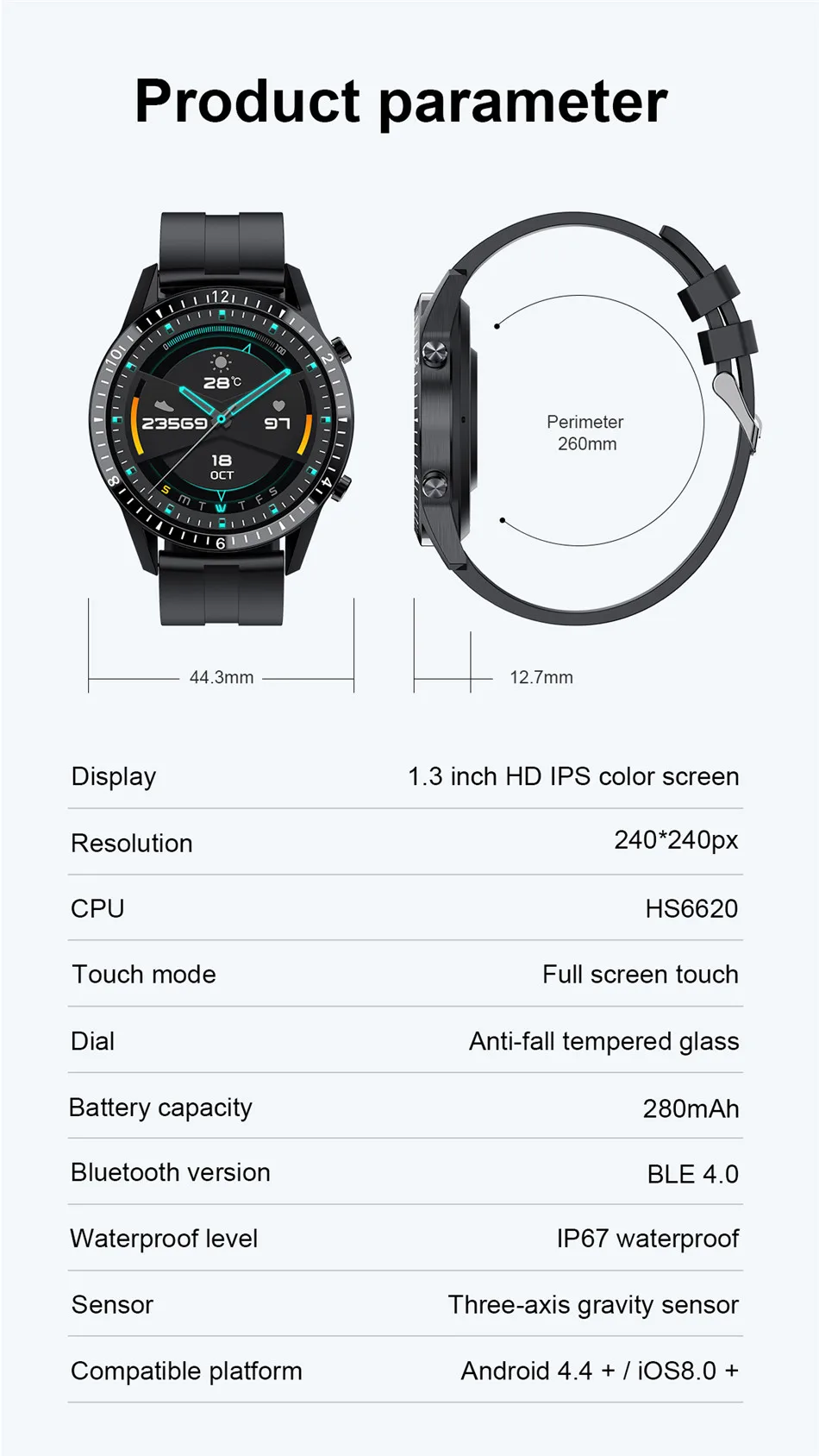 Сенсорный экран: Полное сенсорное управление Разрешение: 240*240 px Тип батареи: полимерная литиевая батарея Емкость аккумулятора: 200 мА Время зарядки: около 60 минут Время работы: 5-7 дней Время работы в режиме ожидания: около 30 дней Материал: цинковый сплав/пластик + ТПУ/кожа на выбор Особенности продукта Основная функция приема/отклонения телефонных звонков/телефонных звонков Мониторинг сердечного ритма Мониторинг кровяного/кровяного давления кислорода Мониторинг сна Напоминание о сидячем положении Спортивный шагомер/потребление калорий/Запись трека/время упражнений Напоминание о звонке и отображение Сообщение толкается и отображается Камера дистанционного управления Автоматическое Измерение частоты сердечных сокращений Мульти-спортивные измерения Напоминание о часах Напоминание о тревоге По умолчанию Наберите 5 видов циферблатов. Индивидуальные Циферблаты часов по желанию приложения Поддержка приложения Язык английский, японский, корейский, немецкий, испанский, французский, итальянский, русский, португальский, арабский, китайский, Поддержка интерфейса английский, китайский, испанский, французский, русский, португальский, польский Сообщения push up Поддержка языка английский, китайский, испанский, французский, русский, португальский, польский Посылка: ремешок для часов, зарядное устройство, коробка, руководство пользователя