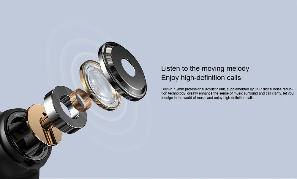 Встроенный 7,2 мм профессиональная акустическая блок, дополненная DSP цифровой подавление шума технологии, значительно увеличивает ощущение объемного звучания музыки и четкость звука при звонке, позвольте вам побаловать себя в мире музыки и наслаждаться вызовами высокой четкости.