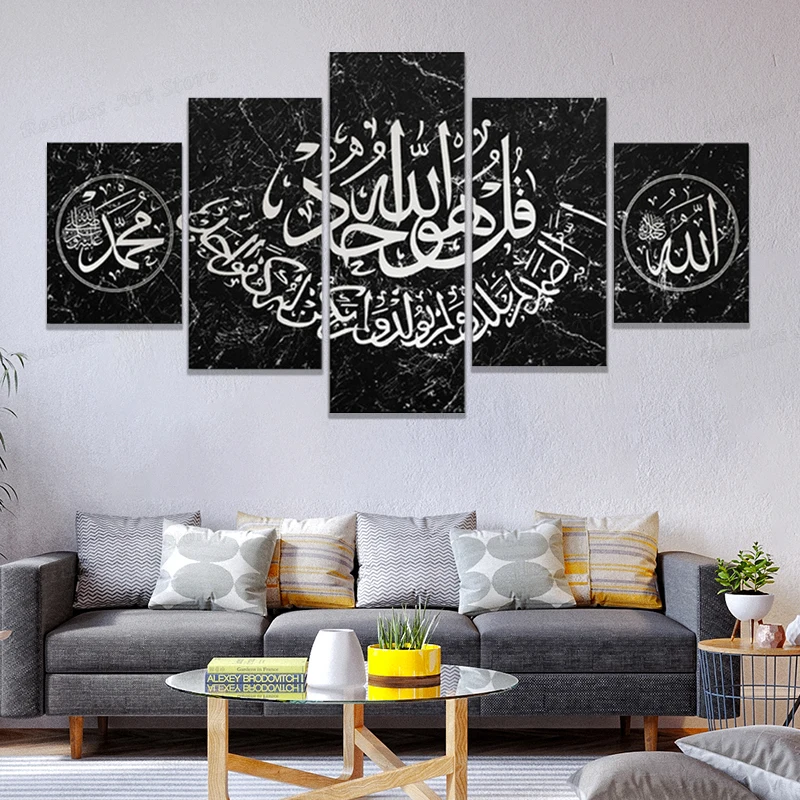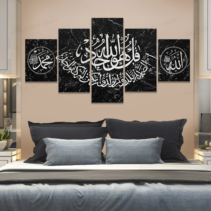 Surah Ikhlas арабский Коран Каллиграфия, 5 панелей, мусульманский настенный плакат и принты, Аллах, мусульманский домашний декор, холст, картина, рамка