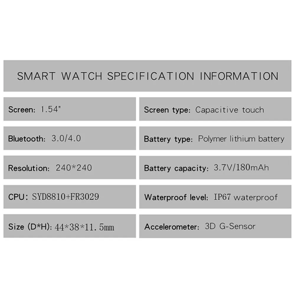 1. Модель: P6 2. Размеры: 44*38*11,5 мм 3. Экран: TFT 4. Размер экрана: 1,54 дюйма 5. Разрешение: 240*240 6. Чип: SYD8810 + FR3029 7. Оперативная память + флэш-память: 24 Кб + 256 КБ 8. Bluetooth: 3,0/4,0 9. Емкость аккумулятора: 180 мАч 10. Способ зарядки: зажим для зарядки 11. Время зарядки: 1,5 h 12. Срок службы батареи: 7 дней 13. Режим касания: Полное касание 14. Водонепроницаемость: IP67 15. Приложение: HryFine 16. Системные требования: Android5.0 + / IOS9.0 +