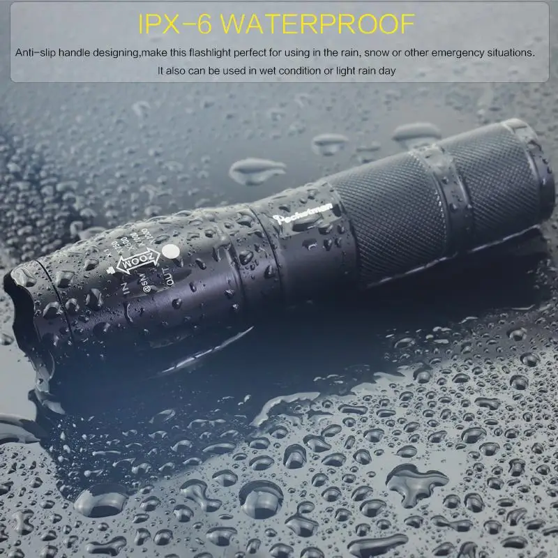 -Материал корпуса: алюминиевый сплав.-Источник: светодиодный светильник T6, L2, V6.-Расположение режима: Высокий> Средний> Низкий> Быстрый стробоскоп> SOS.-Отражатель: алюминиевый отражатель.-Расположение переключателя: на задней крышке.-Тип переключателя: кнопочный переключатель.-Светодиодный чип на плате) Срок службы: около 50000 часов.-Батарея: 1*18650 батарея (не входит в комплект) или 3 * AAA батареи (не входят в комплект).-Внутренняя цепь принимает эффективные выходные схемы постоянного тока.-Поддержка ручной фокусировки, для удобства в эксплуатации.-Водонепроницаемый дизайн, компактный размер и удобно носить с собой.-Особенно подходит для таких видов активного отдыха, как кемпинг, туризм и т. д..