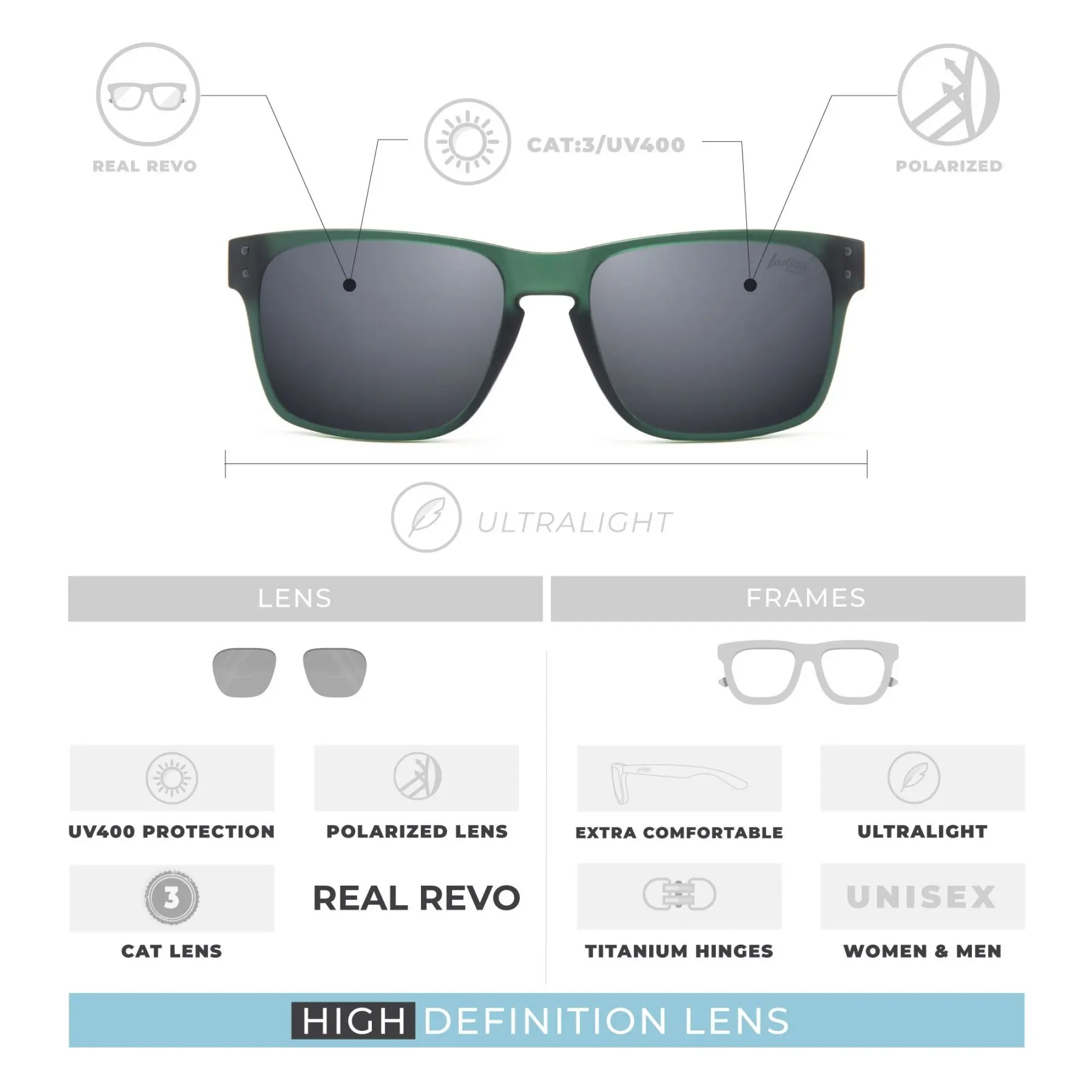 Солнцезащитные очки с поляризацией для индийского лица Freeride Green для мужчин и женщин