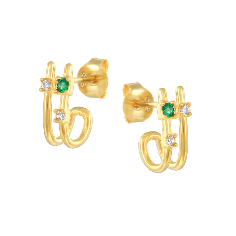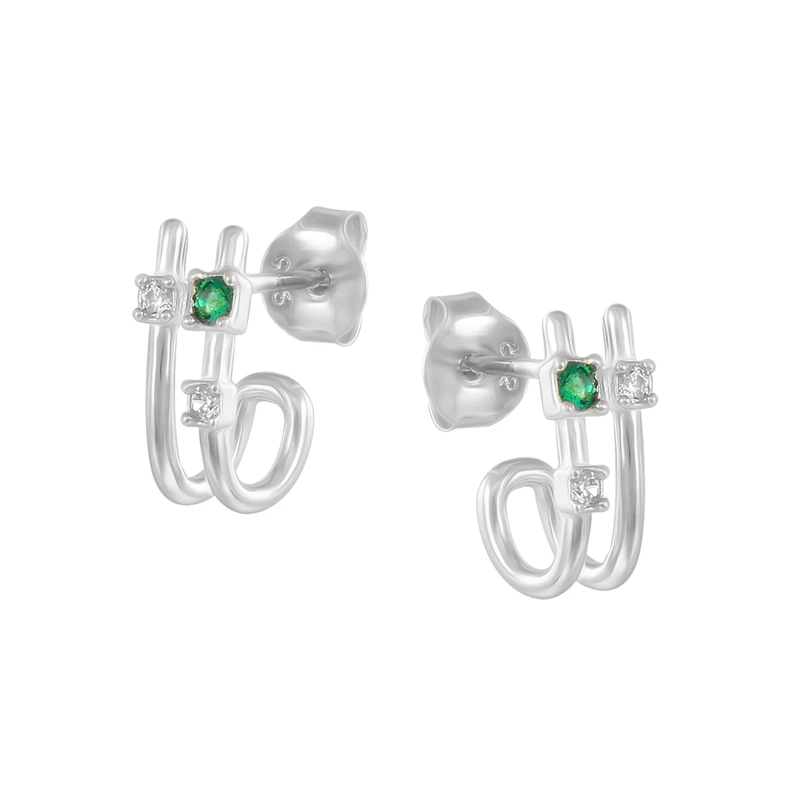 Серьги-гвоздики женские двойные из серебра 925 пробы с зеленым цирк...