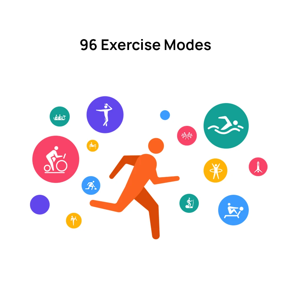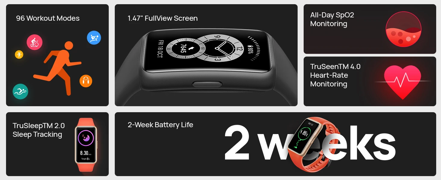 Мониторинг SpO2 в течение всего дня2 недель Срок службы батареиСтропиептм 2,0 отслеживание снаПолноэкранный экран 1,47"Мониторинг сердечного ритма TruSeenTM 4,096 режимов тренировки