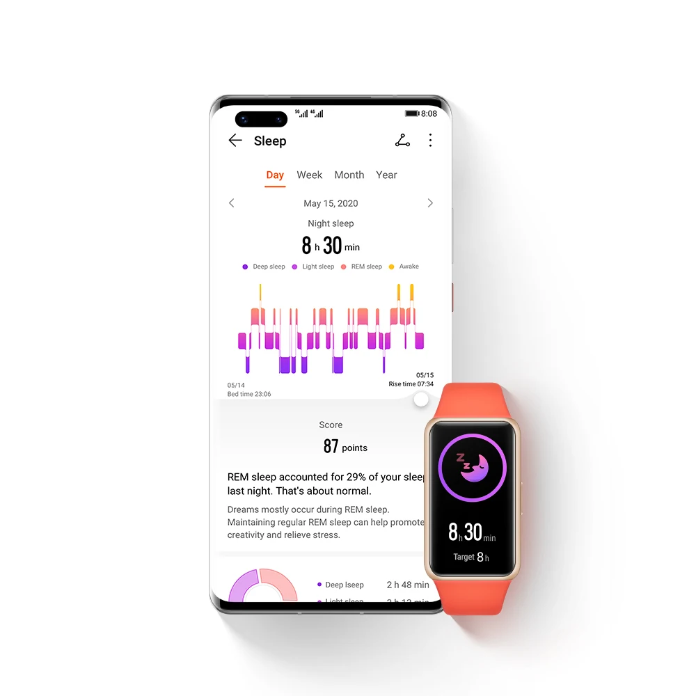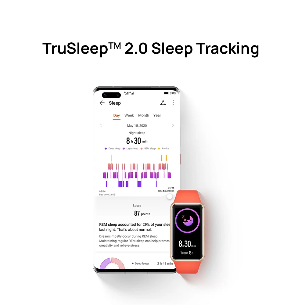 Хроническое низкое насыщение крови кислородом, SpO2, может привести к усталости, потере памяти и даже повреждению мозга и сердца. По этим причинам вы захотите убедиться, что вы всегда находитесь в безопасной зоне. HUAWEI Band 6 имеет встроенную систему обнаружения SpO2 *, которая контролирует насыщенность крови кислородом 24/7. Если он падает слишком низко, браслет будет вибрировать, так что вы можете взять время, чтобы дышать и восстановить равновесие.* Насыщение кислородом в крови относится к фракции насыщенного кислородом гемоглобина относительно общего гемоглобина в крови. Этот продукт не является медицинским устройством и не предназначен для диагностики, лечения, лечения или предотвращения каких-либо заболеваний. Доступность может варьироваться в зависимости от региона.
