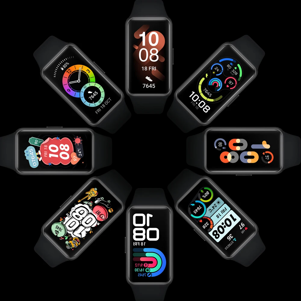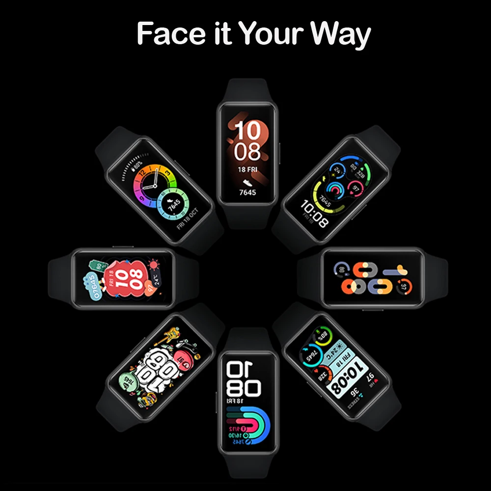 С 1,47 "Полноразмерным экраном, с 148% большим размером дисплея, чем предыдущее поколение, HUAWEI Band 6 приносит вам большее видение.Модель из стекла 2.5D arc, HUAWEI Band 6 имеет универсальный внешний вид, что позволяет добиться большего прогресса в использовании сенсорного экрана.