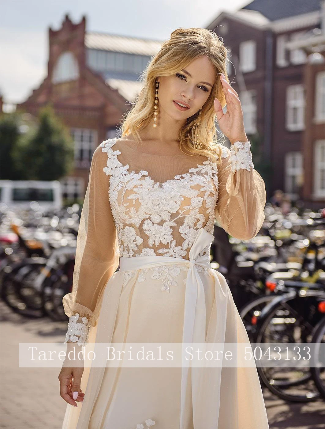 Соблазнительное свадебное платье цвета шампанского с юбкой-годе со съемной юбкой, Кружевная аппликация цвета слоновой кости, прозрачное Тюлевое платье невесты с глубоким круглым вырезом и длинными рукавами