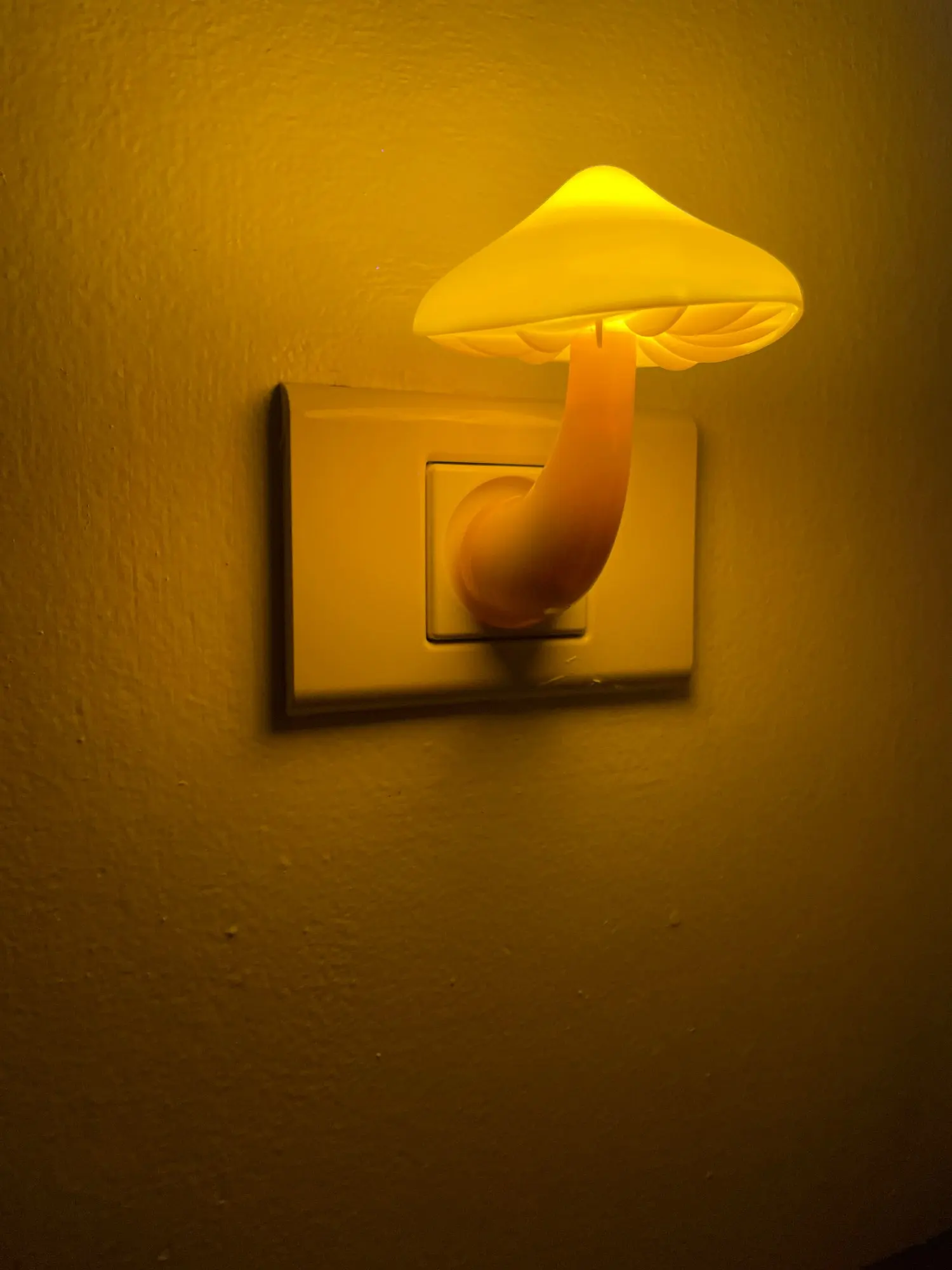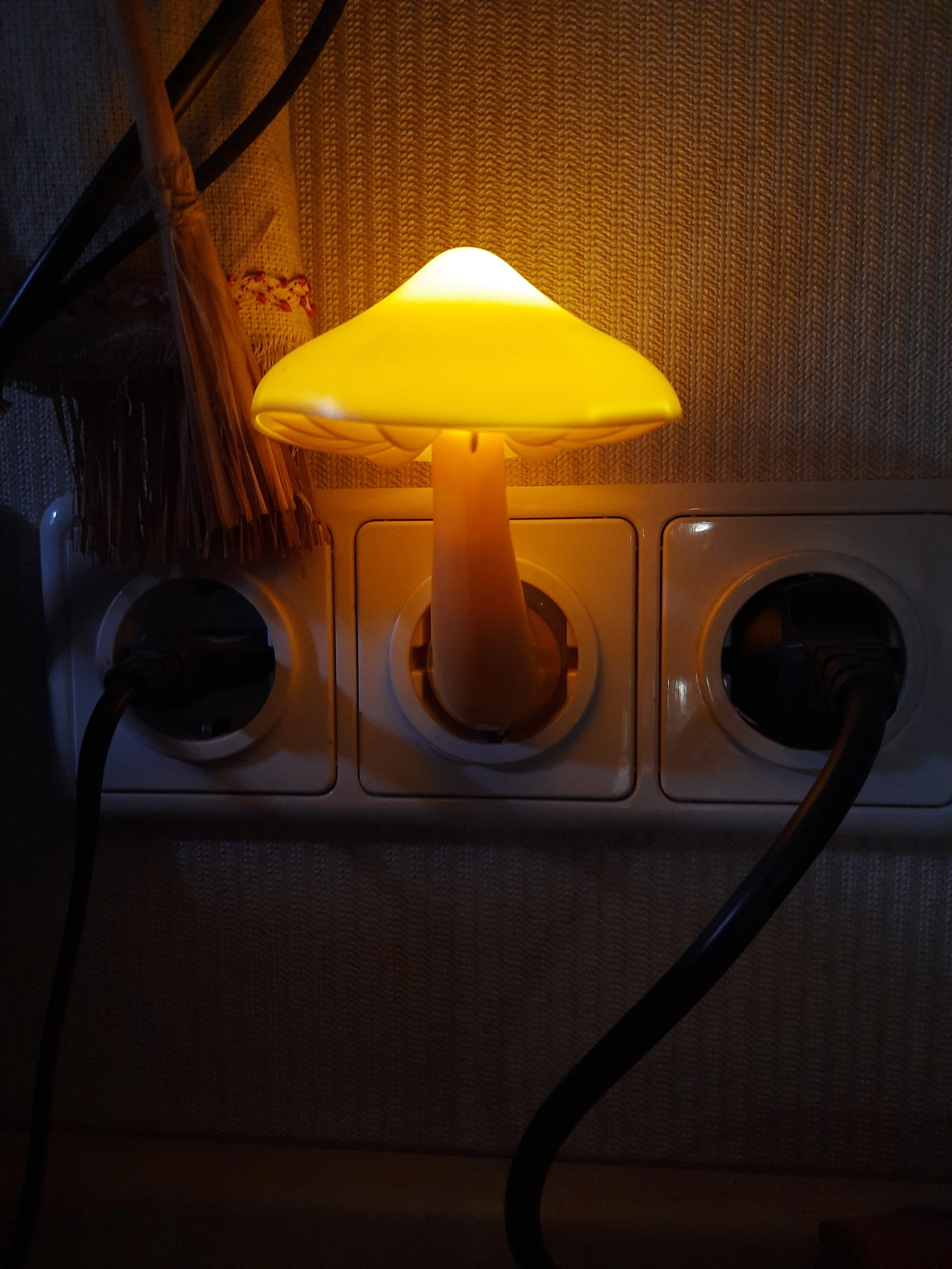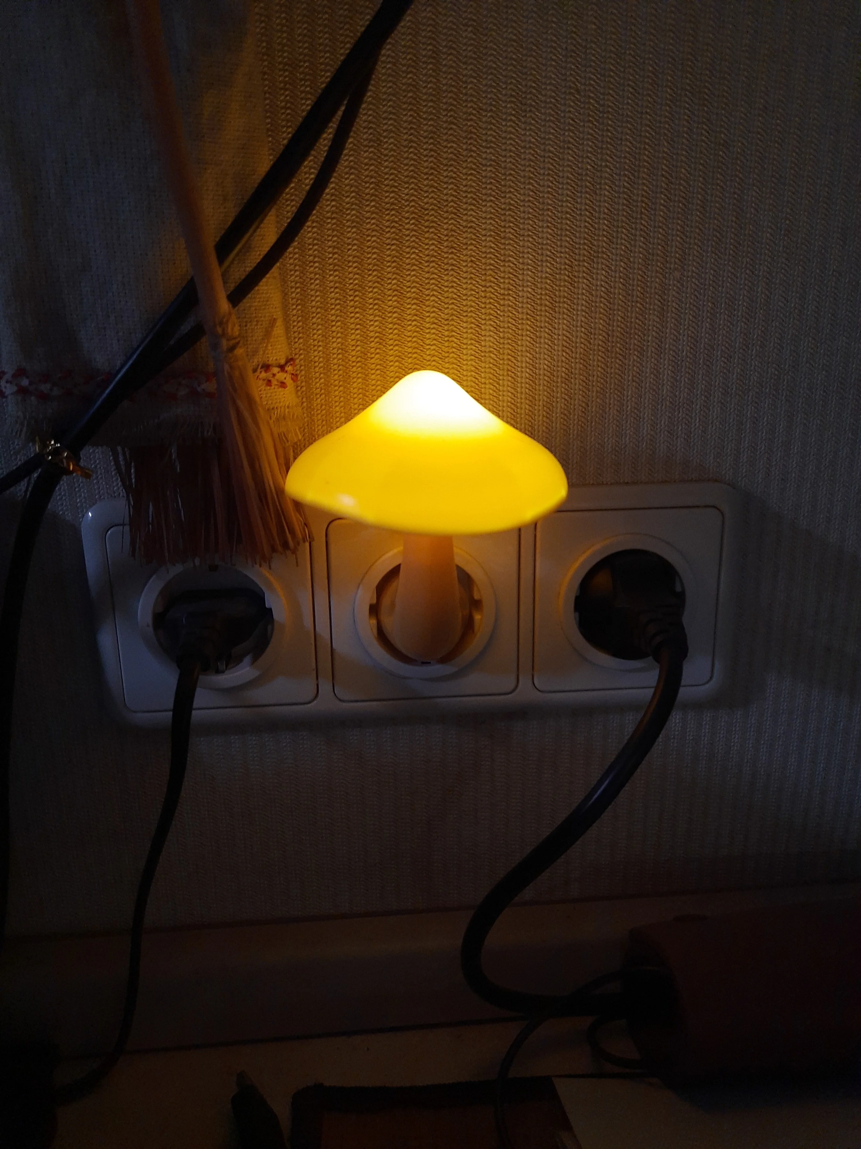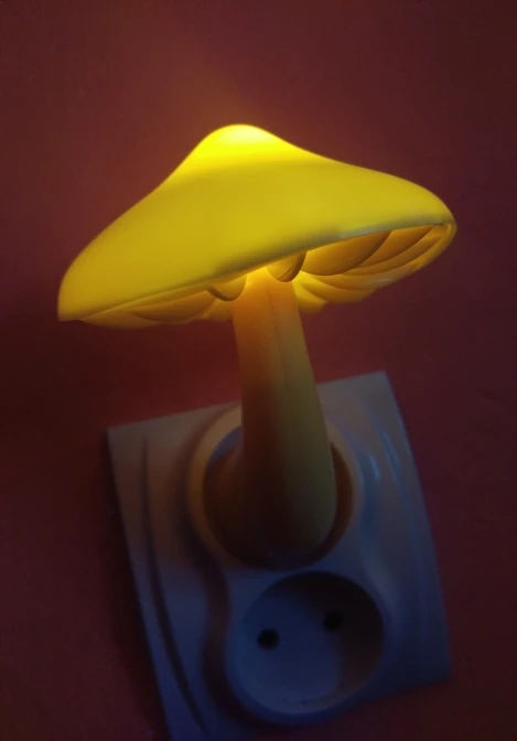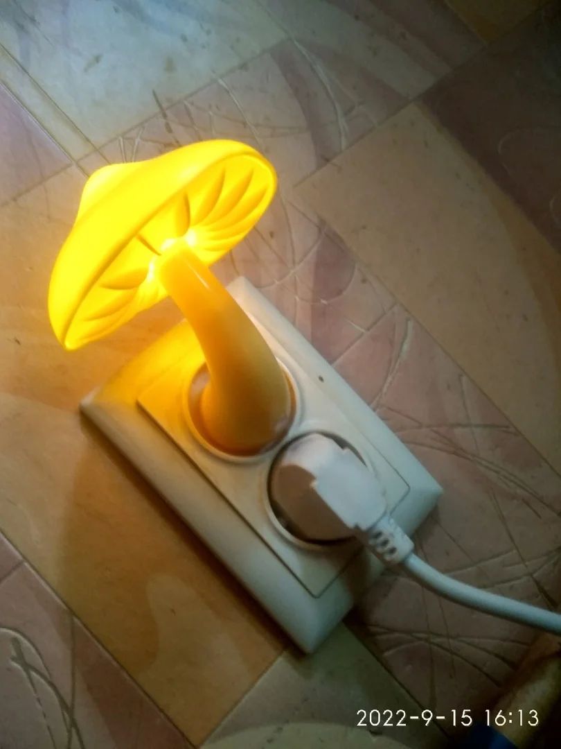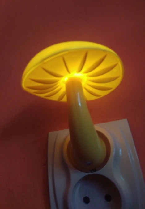 Шляпа гриба пластиковая - жесткая. Фото элемент полностью его не отключает тк сам на него и светит. На вид мило, как ночник использовать можно