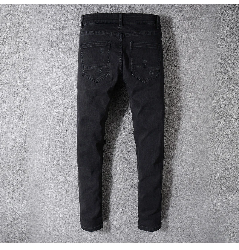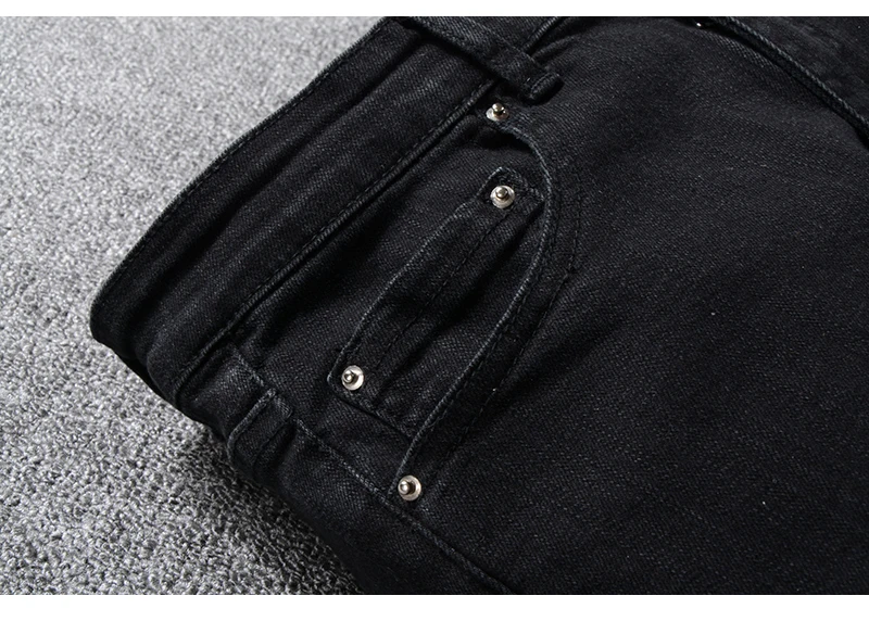 Новые мужские черные Лоскутные облегающие Стрейчевые джинсы в байкерском стиле для езды на мотоцикле повседневные обтягивающие рваные состаренные брюки
