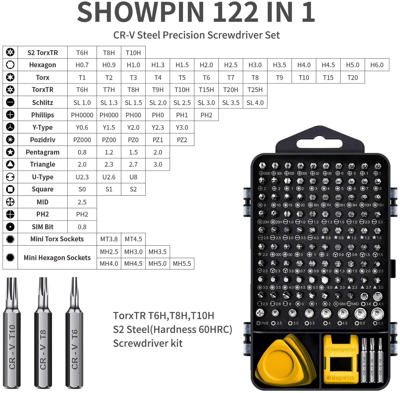 ????122 122 в 1 многофункциональная отвертка kit】набор отверток 122 в 1 включает в себя 98 отверток, 3 отвертки TorxTR, 1 намагниченная ручка водителя, 1 намагничиватель/размагничиватель, 1 Гибкий Удлинительный вал, 1 Шестигранная втулка для беспроводных дрелей, 1 Антистатический пинцет, 2 пластиковых зубчатых коронки, 3 ультра-тонких и 6 нормальных инструментов для треугольных прутьев, 1 микро винтовая Магнитная прокладка, 1 sim-карта и 1 присоска.