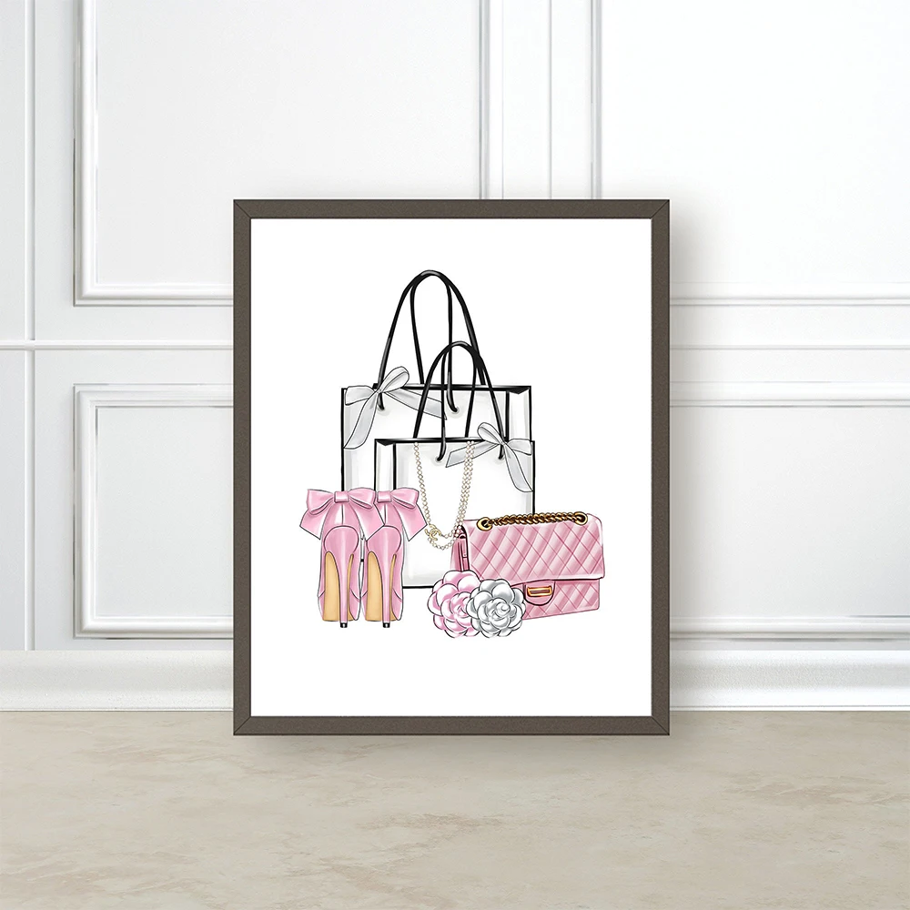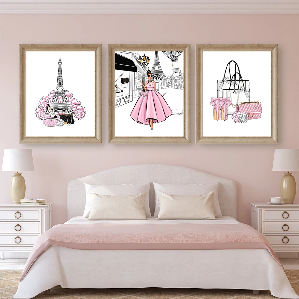 Модный художественный постер, сумки с розовыми цветами, башня Парижа, шопинг, холст, печать, настенная живопись, салон красоты, украшение для комнаты для девочек, картина