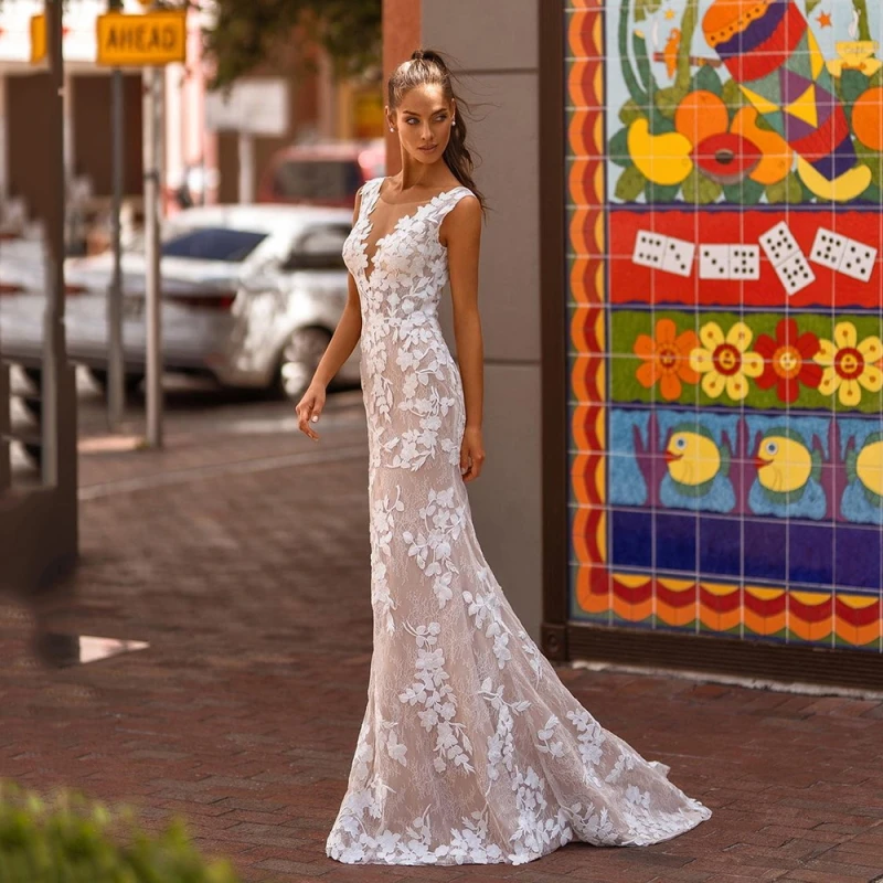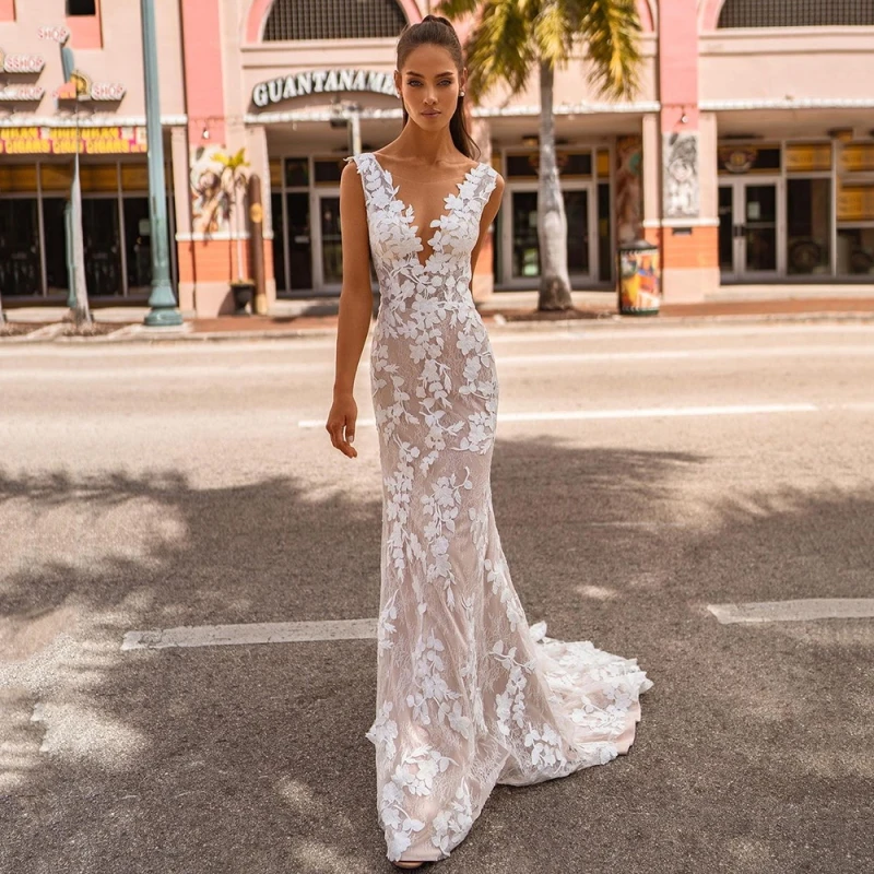 Женское платье с V-образным вырезом Fanweimei, кружевное платье для невесты с цветочной аппликацией и открытой спиной, свадебное платье