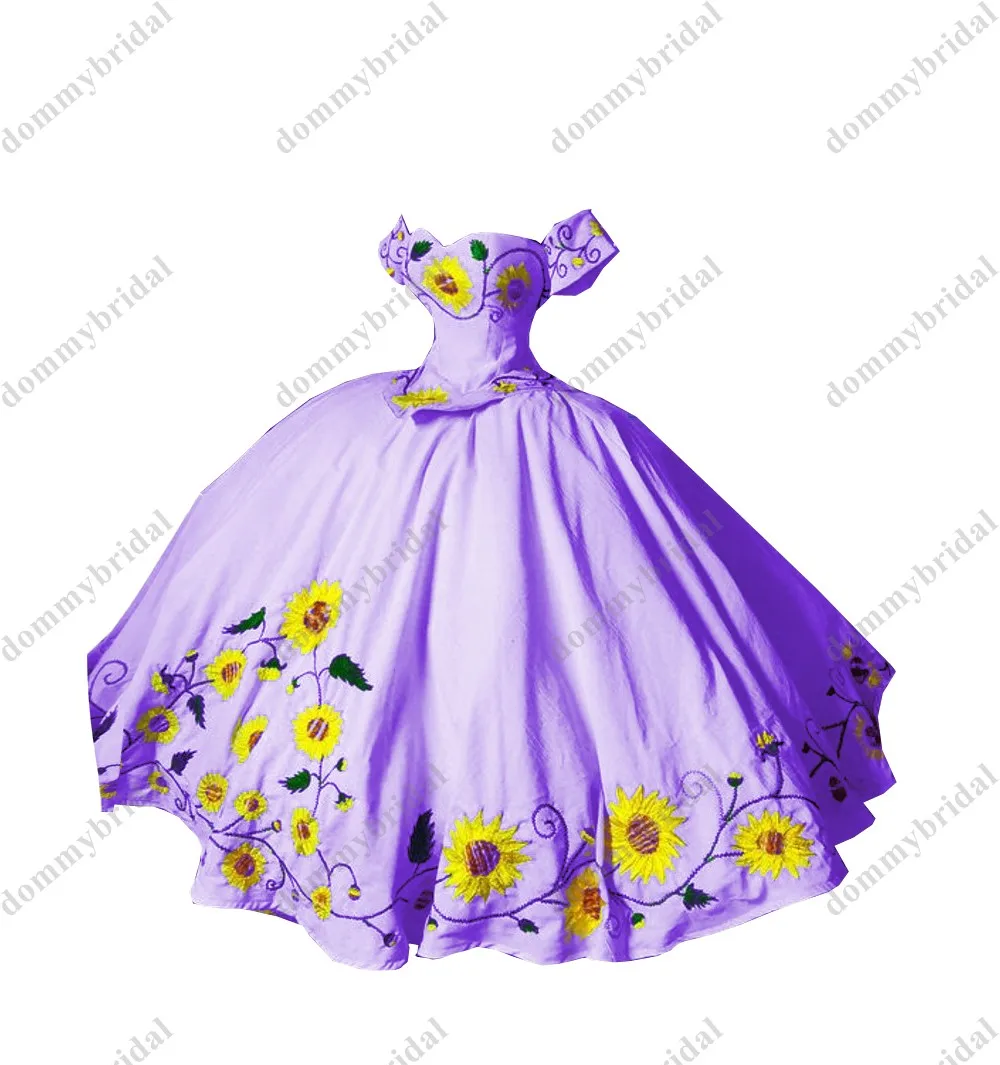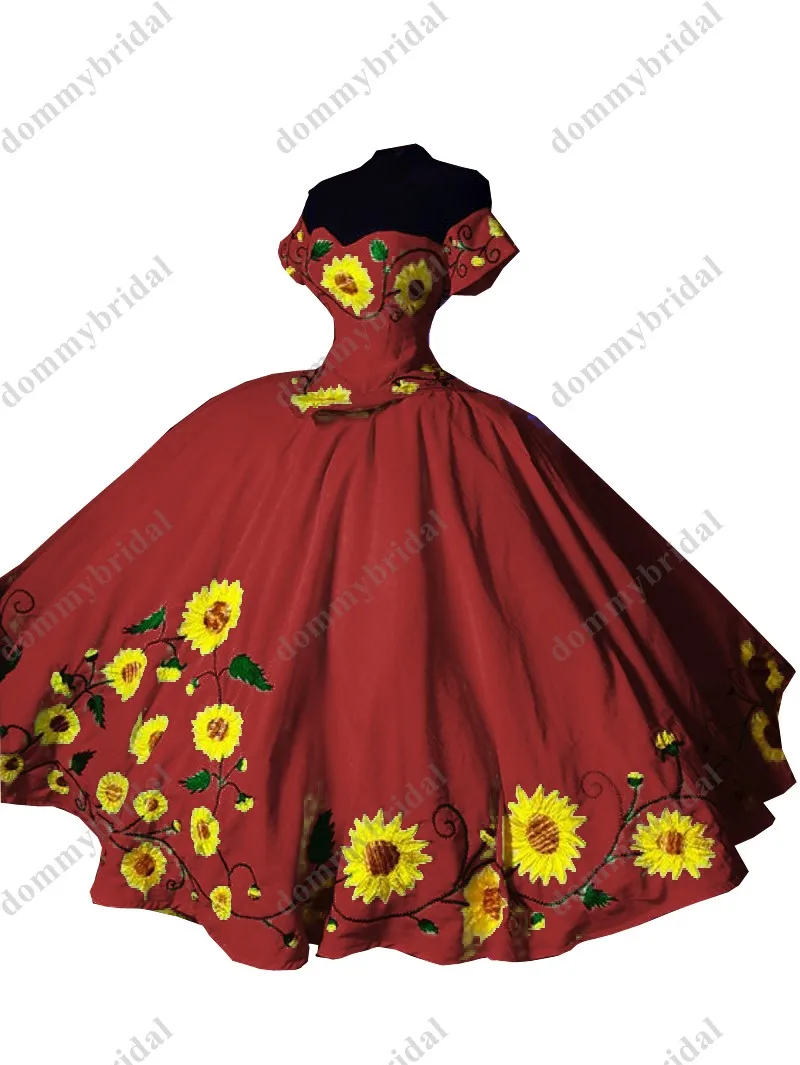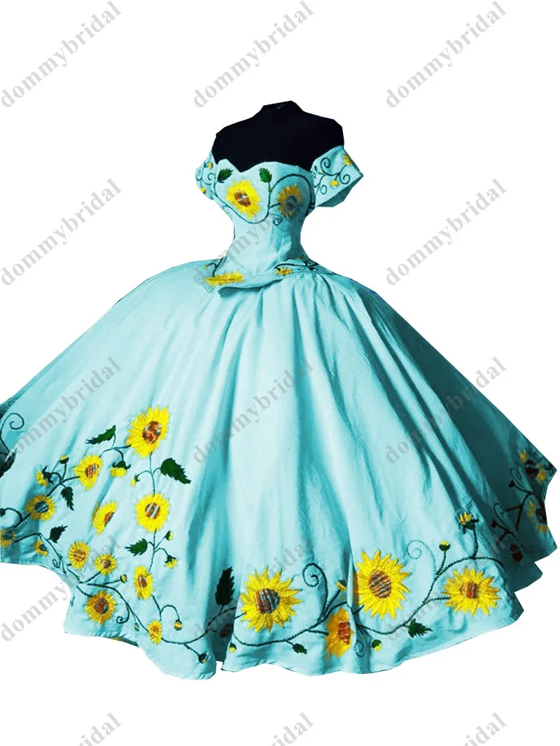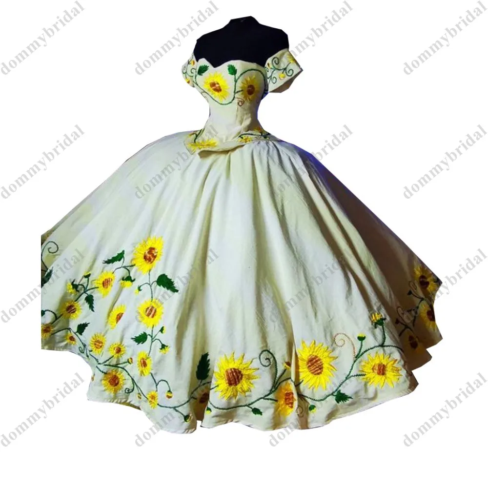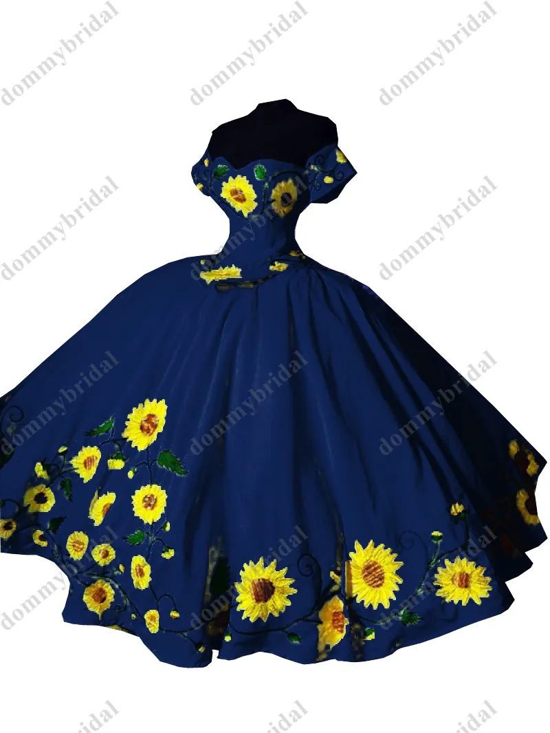 2022 темно-синее бальное платье с вышивкой в виде подсолнуха, Дешевое платье Quinceanera, мексиканское атласное платье Charro с открытыми плечами и рукавами, официальное платье для выпускного вечера