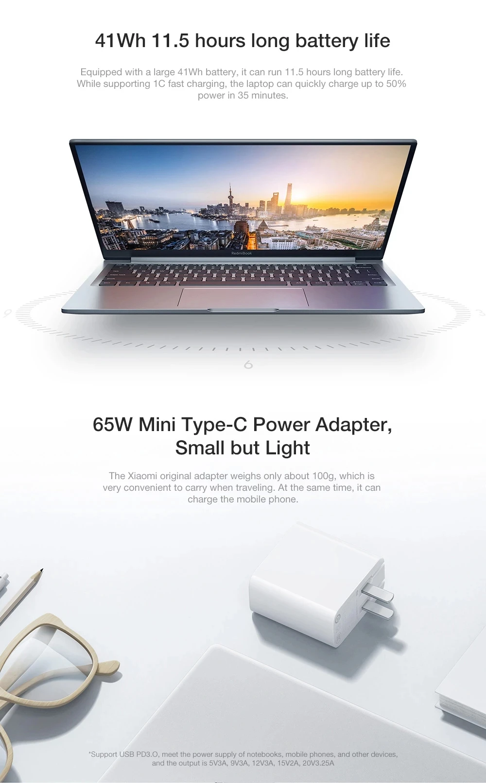 11,5 часов продолжительное время работы от аккумулятораТонкий корпус оснащен 41 ватт-час батареи, которая еще раз своей собственной превзойти, 11,5 часов продолжительное время работы от аккумулятора, который может легко удовлетворить офисных нужд. В то же время, он поддерживает быструю зарядку 1C, которая может быстро зарядить 50% аккумулятора за 35 минут."Адаптер питания Mini Type-CМини-адаптер весит всего около 100 г, складной штекер тщательно разработан, и он маленький и светильник. В то же время, он может заряжать мобильный телефон, его достаточно, чтобы вынуть его.
