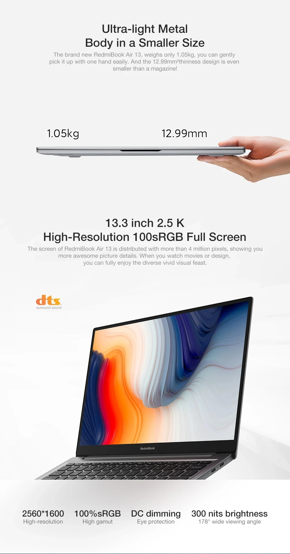 Новое поколение RedmiBook Air 13, который является как светильник как 1,05 кг и очень тонкие, 12,99 мм, меньше, чем журнал и может быть подобраны для девочек одной рукой. Фюзеляж принимает закругленный стальной Пескоструйный процесс, с простым дизайном и тонкой текстурой.2560*1600 высокое разрешение100% sRGB высокая цветовая гамма (типичное значение)Поддержка затемнения постоянного тока, удобная и приятная для глаз300 нит высокая яркость, 178 ° Широкий угол обзора (типичное значение)