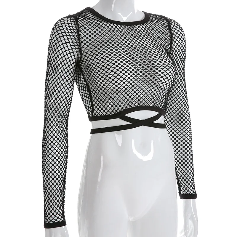 Сексуальный летний сетчатый кроп-топ, Женская Сетчатая футболка с длинным рукавом, облегающие женские прозрачные сетчатые топы, новые готические повседневные футболки, пляжный сетчатый топ
