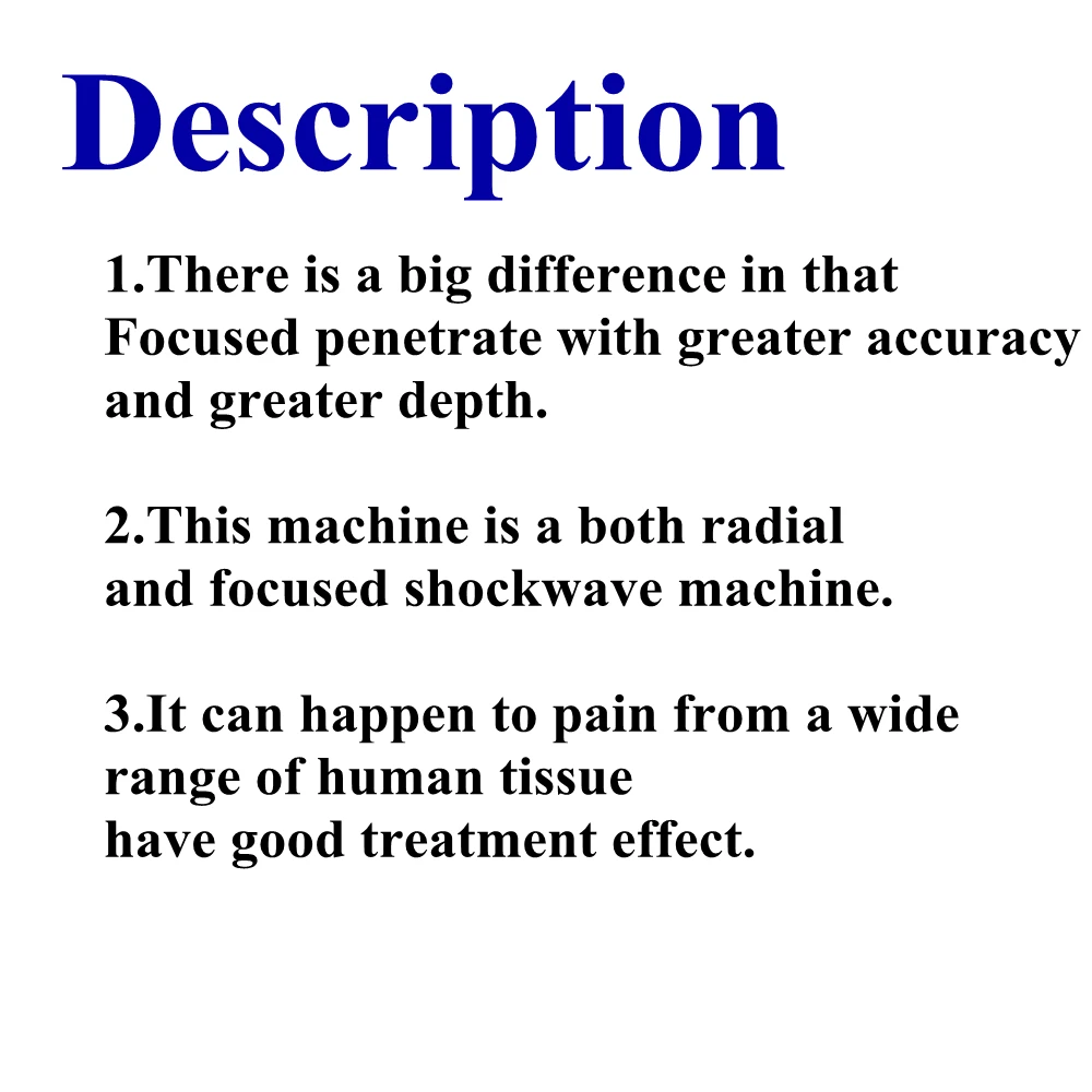 1. Этот аппарат можно использовать для лечения боли в суставах и лечения Эд. 2. Высокая эффективность, быстрое облегчение боли. 3. Предоставляет различные профессиональные зонды. 4. Не повреждает/не повреждает нормальную ткань. 5. Инженерный дизайн обеспечивает настройку и удобство работы. 6. Импортируйте источник питания для обеспечения мгновенного эффекта удара. 7. Выбор импульсного давления и частоты, соответствует требованиям к обработке. 8. Бесшумный воздушный компрессор представляет собой встроенную сборную коробку аксессуаров. 9. Операция не требуется, степень излечения 80 ~ 90%.
