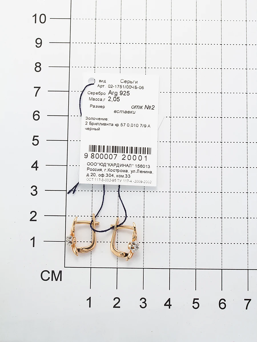 Женские серьги 2021 тренд из позолоченного серебра 925 пробы с 2 бриллиантами. Коробочка в подарок!
