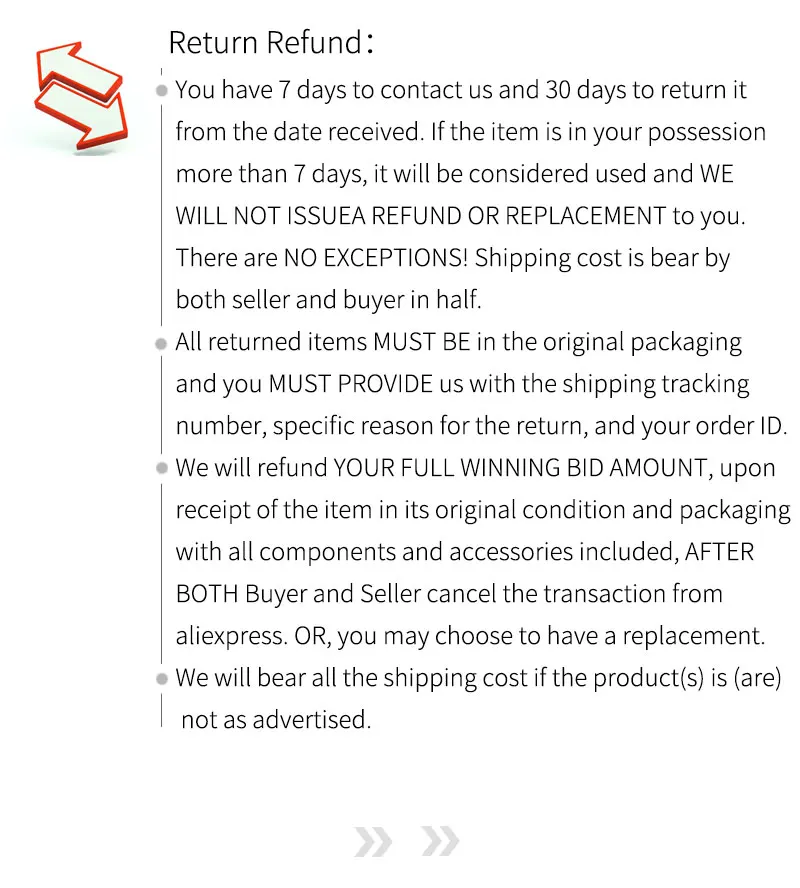 Для того, чтобы позволить покупателям иметь лучший опыт покупок, есть некоторые небольшие советы: ) !Покупатели должны знать, что он или она должны иметь понимание и способность очистить таможенную очистку для своих посылок, gernerally там будет иметь 3 вида ситуаций:1. Таможня не освобождает посылку, и это приведет к возврату, наконец. В этот чехол продавец и покупатели должны поделиться стоимостью доставки в половину и половину.2. Покупатель не желает очищать таможенные посылки и возвращать их. В этом чехол покупатели должны нести ответственность за все транспортные расходы, и продавец не будет нести ответственность за любые транспортные расходы.3. Ошибка при доставке. Перед оплатой вашего заказа, пожалуйста, убедитесь, что ваш адрес доставки и контактный номер доступны и полностью верны. В противном случае компания по доставке не может отправлять посылки покупателям, и в итоге это приведет к возврату. В этом чехол покупатели должны нести ответственность за все расходы по доставке, и продавец не будет нести ответственность за любые расходы по доставке.