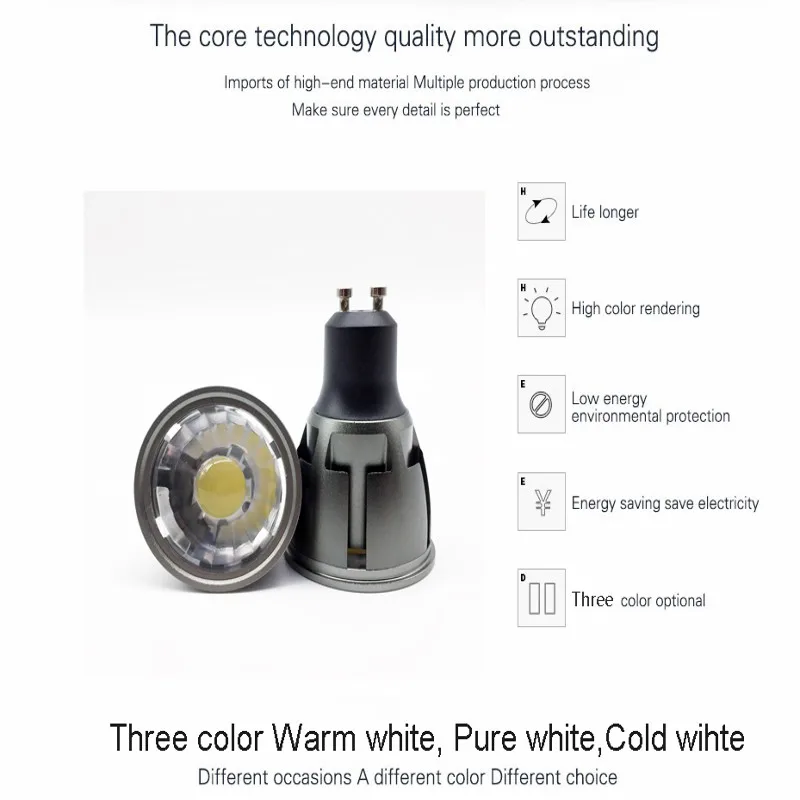 Материал корпуса: алюминийНапряжение: 220 ВМощность: 3 Вт 5 Вт 7 Вт COB светодиодныйТип цоколя: GU10/E27Угол излучения: 60Минимальный срок службы лампы: 50,000 часовТемпература: от-20 до 45CRI: ≥ 85Ra. Хороший индекс цветопередачиЛюмен: 3 Вт 760лм 5 Вт 960лм 7 Вт 1200лмЦвет украшения: холодный белый. Натуральный белый. Теплый белыйСертификаты: CE и RoHSГарантия: 3 года