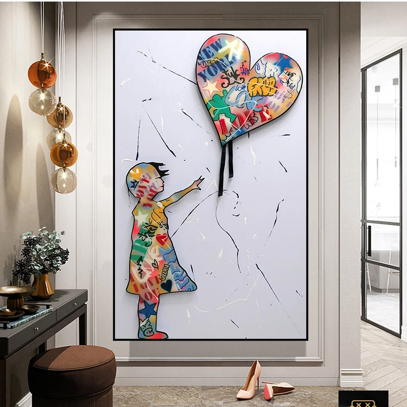 Граффити Бэнкси рисунок мальчик сердце воздушный шар Холст Картина улица абстрактный красочный постер Настенная картина для декора спальни
