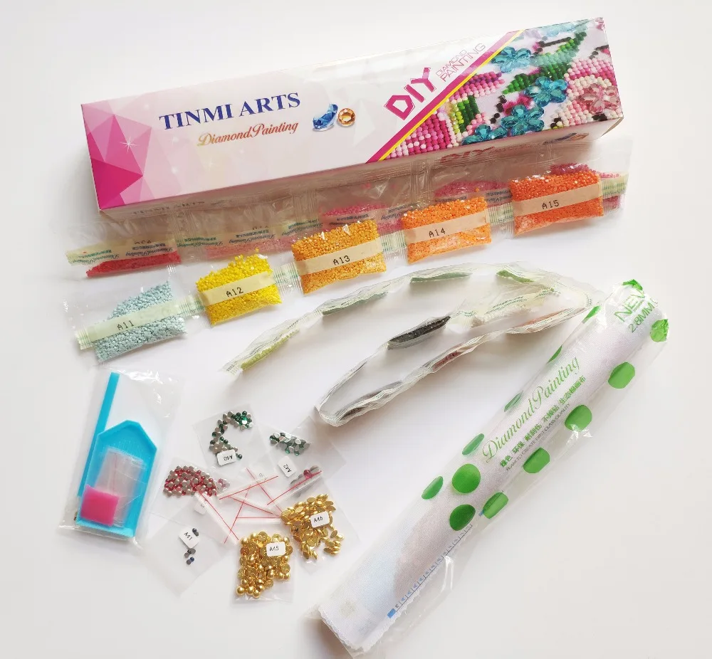 1. Откройте посылка, которую вы получили, выньте холст, алмазы, инструменты (1 ручка для сверления, 1 Пластмассовый Лоток, 1 клей)