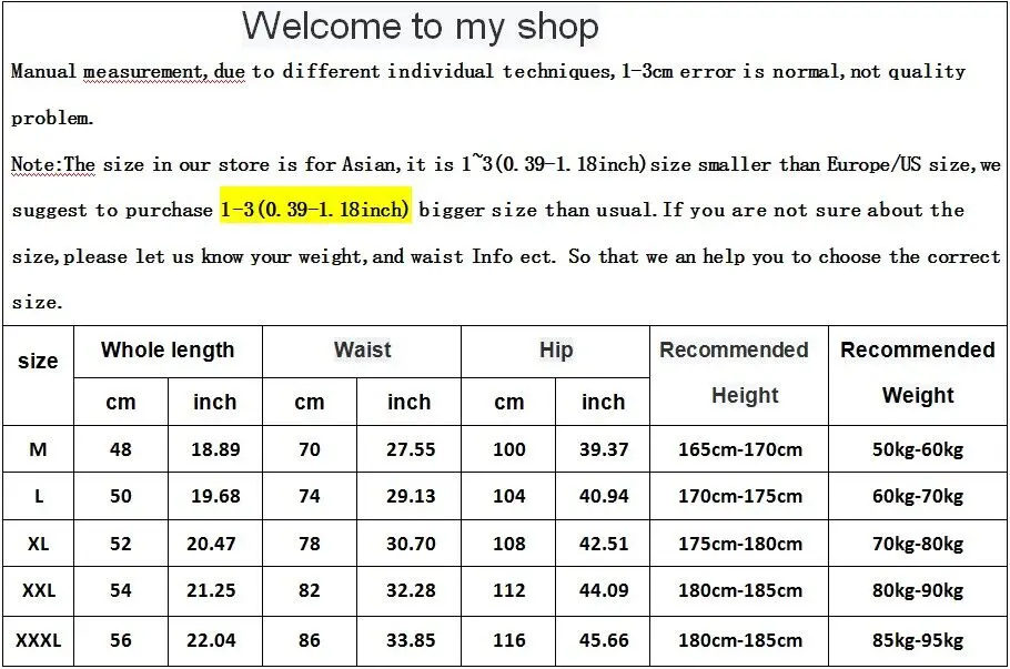 Примечание: размер в нашем магазине Азиатский, он на 1 ~ 3 (0,39-1,18 дюйма) меньше Европейского/американского размера, рекомендуем приобрести на 1-3 (0,39-1,18 дюйма) большего размера, чем обычно. Если вы не уверены в размере, сообщите нам свой вес, талию и т. Д. Чтобы мы помогли вам выбрать правильный размер.