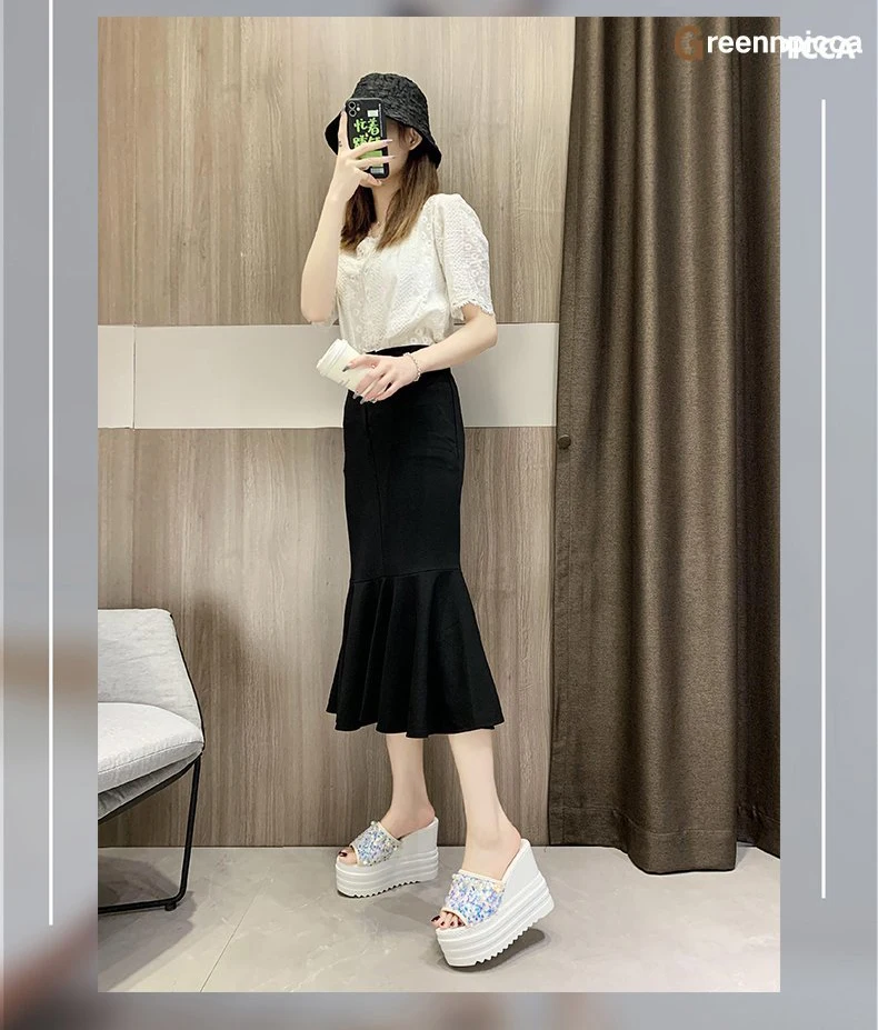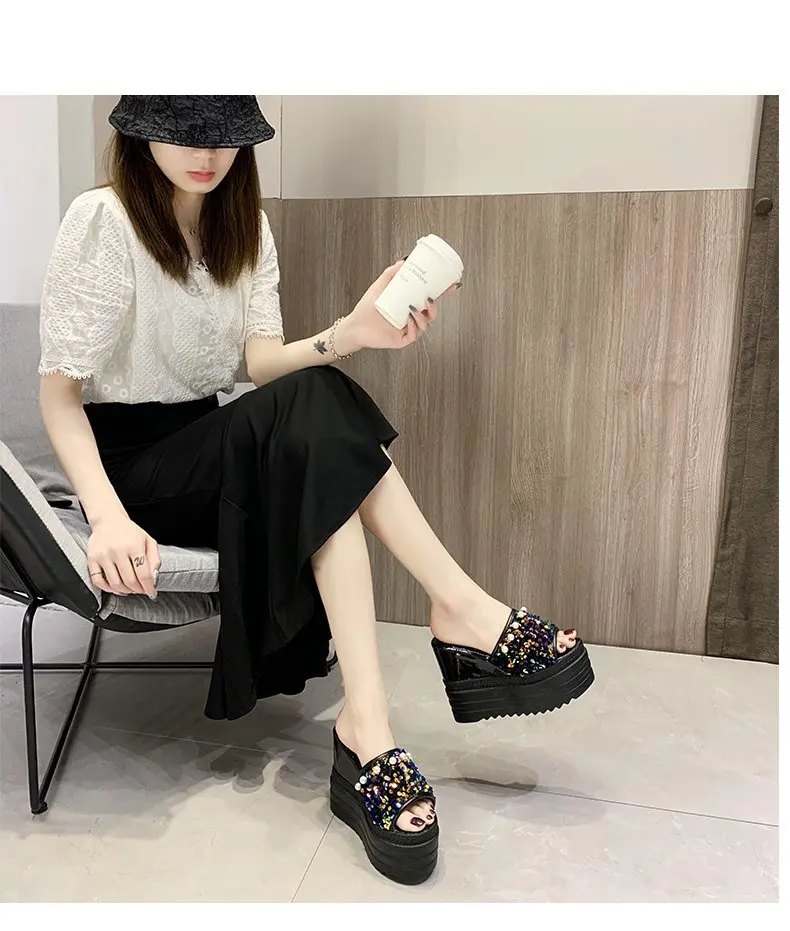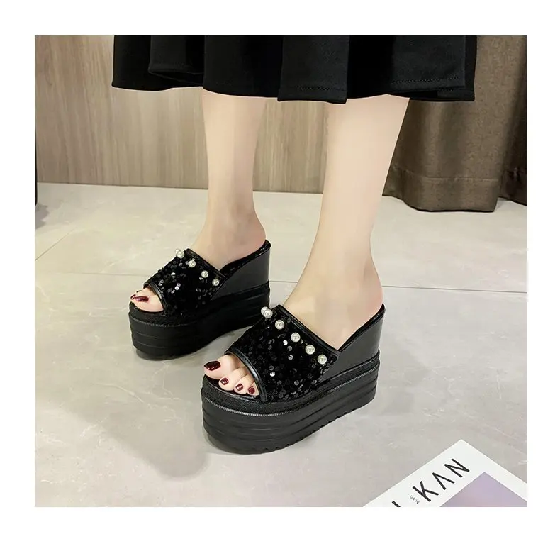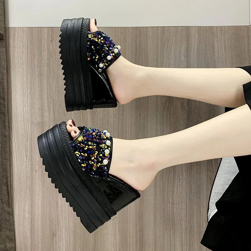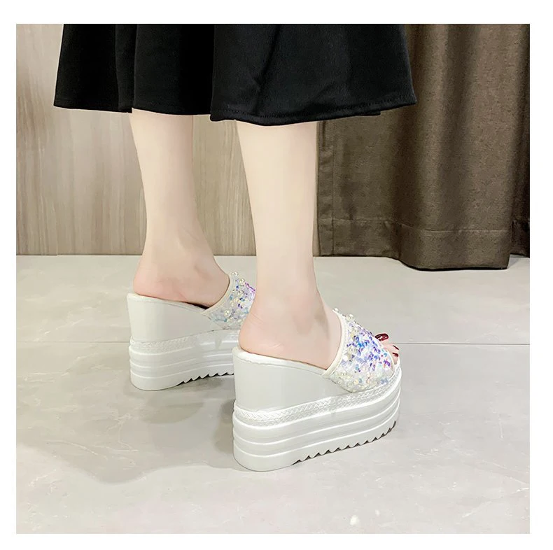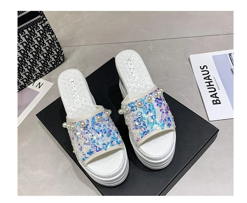 Шлепанцы на высокой платформе; Женские летние пляжные шлепанцы; Женская обувь на танкетке из расшитой блестками ткани; Женские сандалии на толстой подошве
