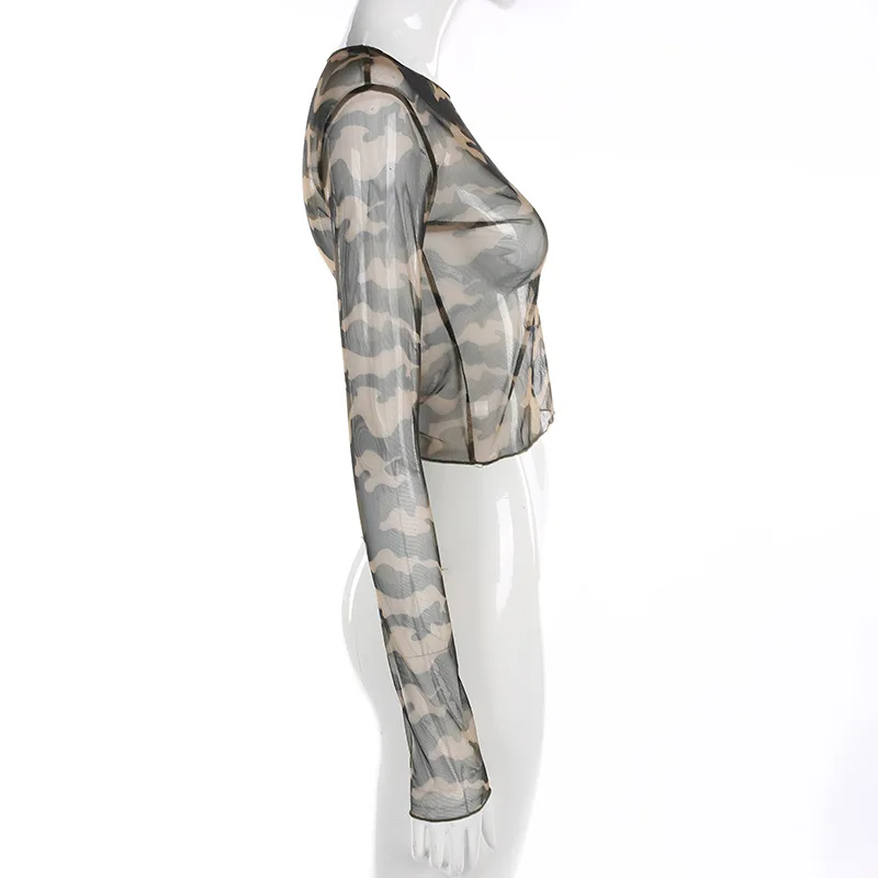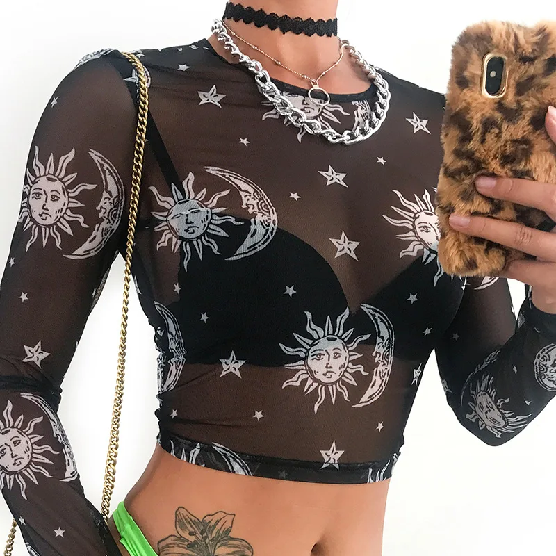 Сексуальная женская футболка, прозрачные сетчатые топы, прозрачная футболка с длинным рукавом, облегающая женская водолазка с татуировкой, новые женские футболки