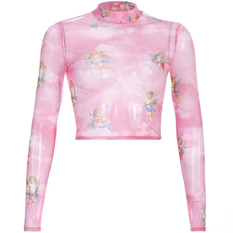 Брэнди Мэнди Сексуальная женская футболка прозрачные сетчатые Топы с длинным рукавом Тонкая Женская водолазка тату футболка новые женские футболки