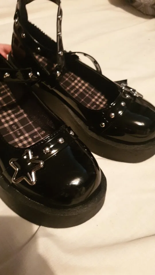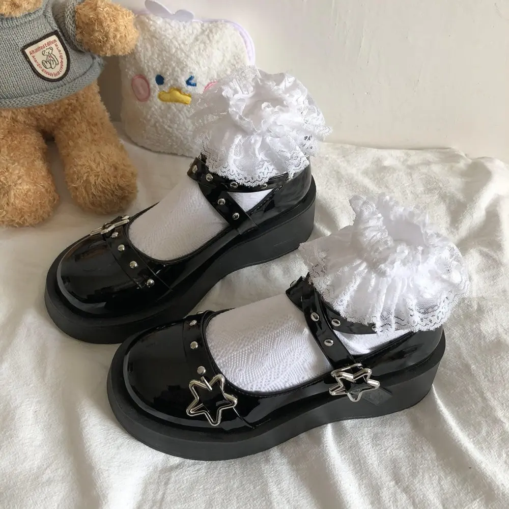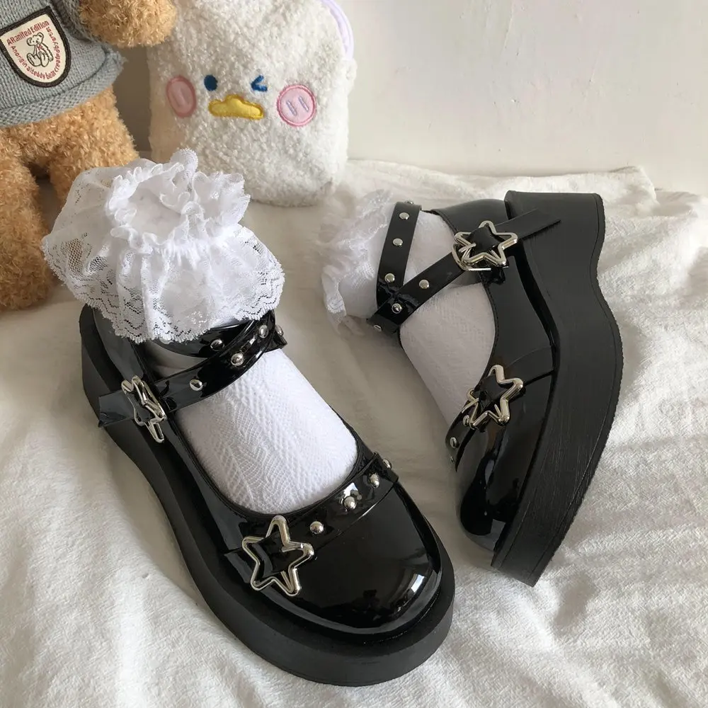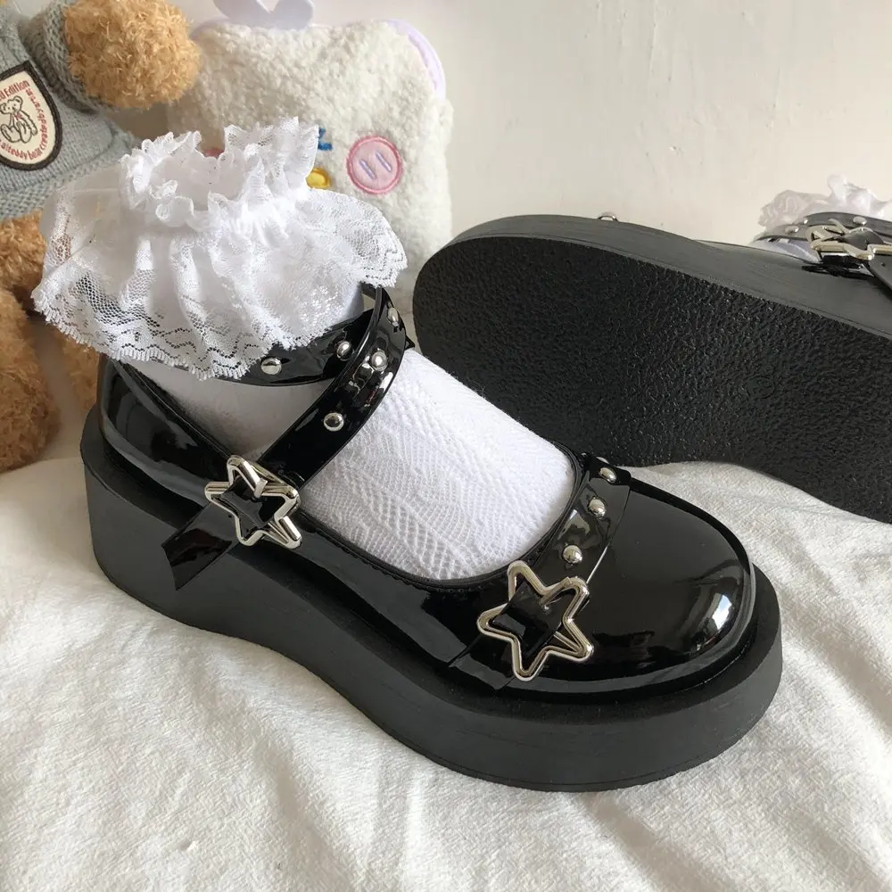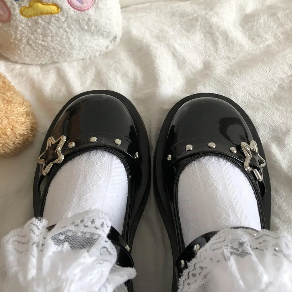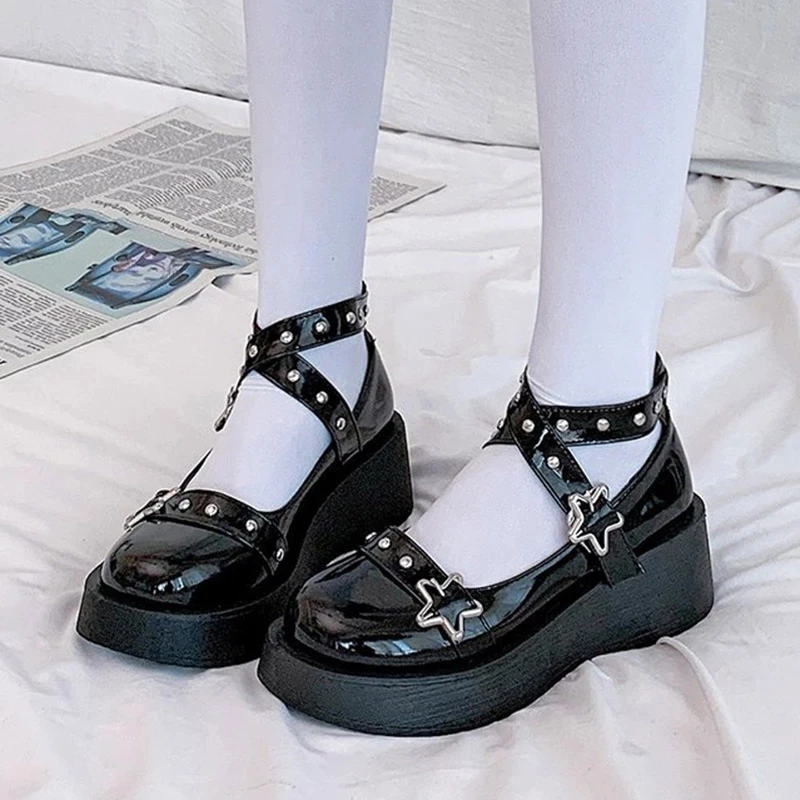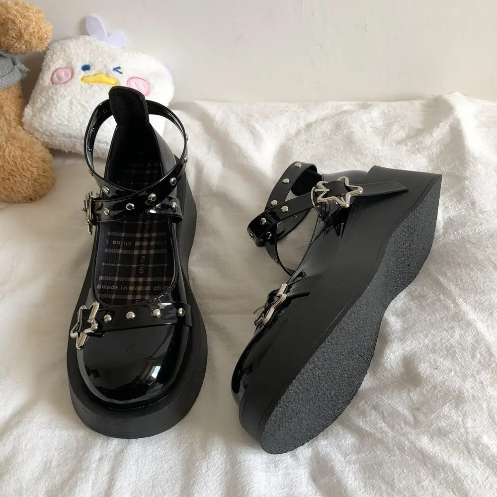 Туфли женские из лакированной кожи с заклепками, туфли Лолиты на платформе, с перекрестной шнуровкой, ремешки со звездами, повседневная обувь для девушек в японском стиле Лолита