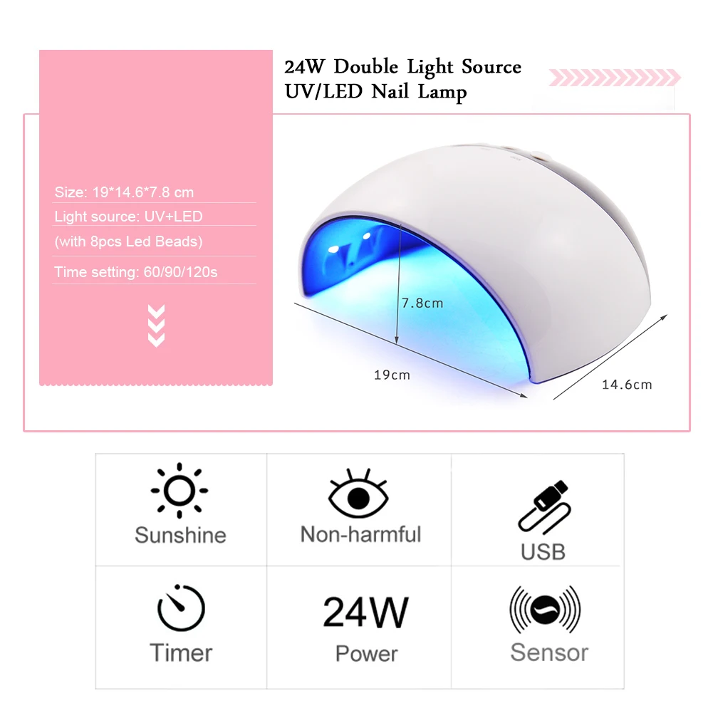 10 * Гель-лак для ногтей1*4 буфер ногати1 * пилка для ногтей1 * розовая пилка для ногтей1 * Розовый сверлильный станок1*24 Вт USB светодиодный светильник для ногтей1 * Изогнутый пинцет1*1 пара отделителей для ногтей1 * вилка для кутикулы1 * Толкатель для кутикулы1 * резак для ногтей1 * Масло для кутикулы1*10 г клей для ногтей1 * верхнее пальто1 * базовое пальто1 * щетка для очистки ногтей2 * наклейки для ногтей3 * наклейка для ногтей для французского маникюра3 * Матовая лента золотого цвета2 * Матовая лента серебристого цвета1 * Стразы1 * Микро бусины украшения Стразы колеса10 * лак для ногтей удаляет влажную бумагу1*10 шт. фиолетовые силиконовые колпачки для удаления ногтей