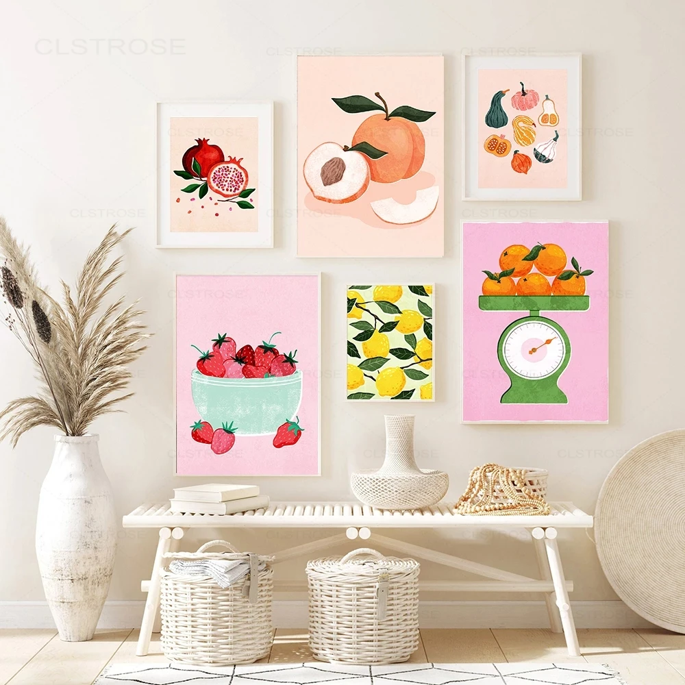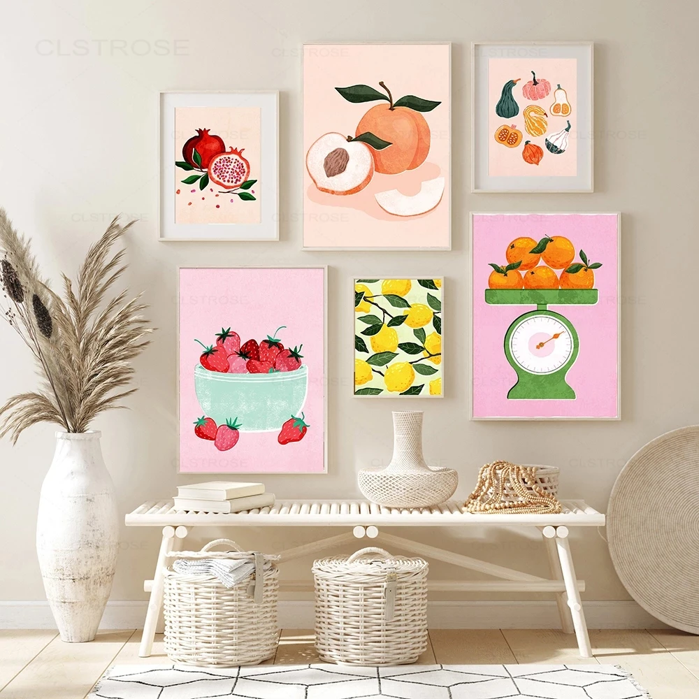 Украшение для фруктов и еды, искусство на холсте с рисунком оранжевого граната, груши, клубники, настенная живопись для декора столовой