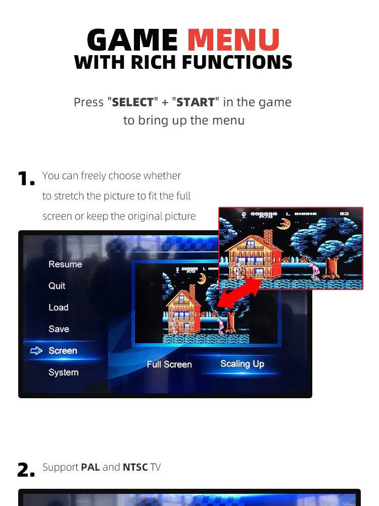 Интерфейс игры также был обновлен во всех сферах, нажмите кнопку «выбрать» + «Пуск», система вернет вас в меню игры1. Вы можете свободно выбрать, растянуть ли картинку, чтобы соответствовать полноэкранному или сохранить оригинальную картинку.2. Игровая консоль поддерживает PAL и NTSC TV.3. Поддержка для мгновенного сохранения игры, чтобы избежать необходимости перезапуска игры.