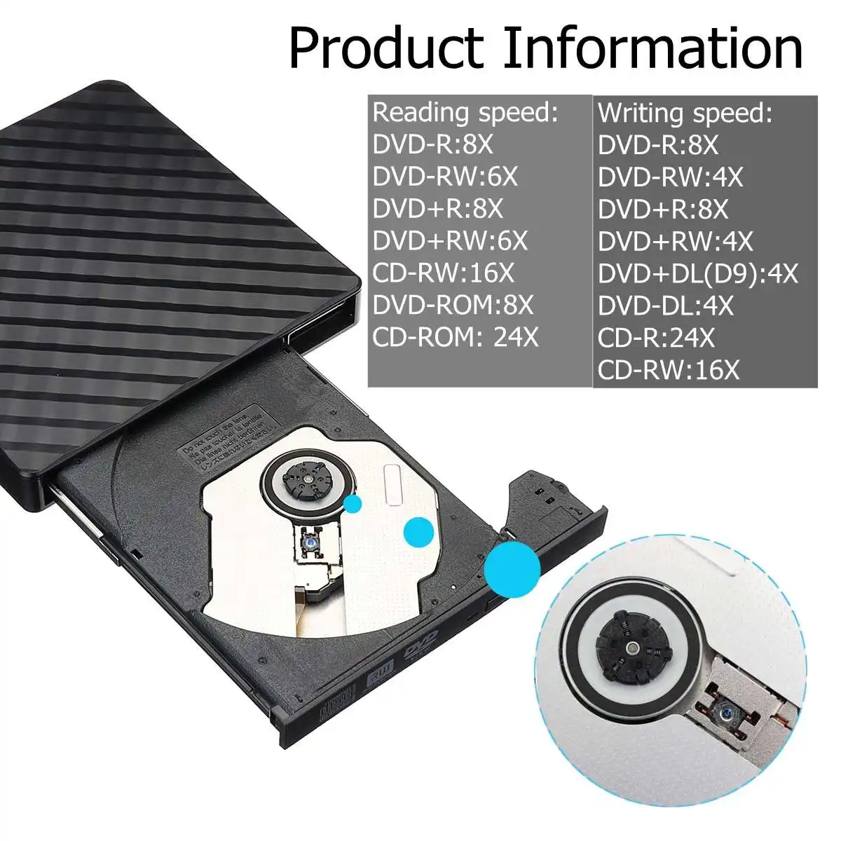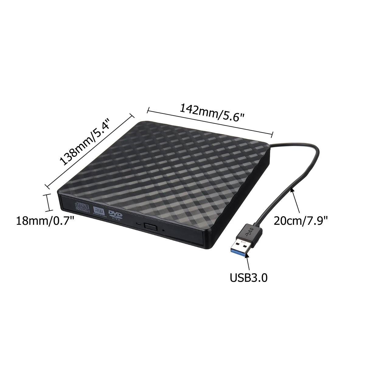 1. Ультратонкий портативный: ультратонкий портативный DVD-привод, легкий, удобный в использовании и переноске дома или в путешествии.2. Порт USB 3,0: стандарт передачи USB3.0, обратная совместимость с USB2.0 и USB1.1 стабильность скорости передачи данных, максимум до 5 Гбит/с.3. Операционная система: совместима с Windows 98 SE, ME, 2000, XP, Vista, Win 7, Win 8, Win 10, Windows Server 2003, 2003 R2, 2008, 2008 R2, 2012, 2012 R2, Mac OS 8,6, Mac10 OS, 2015 27 "retina iMac, Macbook Pro с OS 10.10.5, Macbook Air версии 10.9.5, iMac с el capitan - os x 10,11, Surface Pro Mac OS 8,6, Mac10 OS, 2015 27 "retina iMac, macbook Pro с OS 10.10.5, Macbook Air версии 10.9.5, iMac с el capitan - os x 10,11, Surface Pro4. Подключи и играй: без дополнительного привода и внешнего источника питания, просто подключите его к USB-порту, и драйвер DVD будет обнаружен.5. Высокая Долговечность: хорошо работает при чтении, обладает сильной способностью исправлять ошибки, противоударной технологией и технологией шумоподавления.6. Скорость чтения: Максимальная скорость чтения DVD 8x, максимальная скорость чтения CD 24x.Кабель для передачи данных 7,20 см: кабель для передачи данных адаптирует дизайн встраивания в продукт, импеданс технологии сетка из чистой меди низкий, прочный экран, более стабильная передача данных.