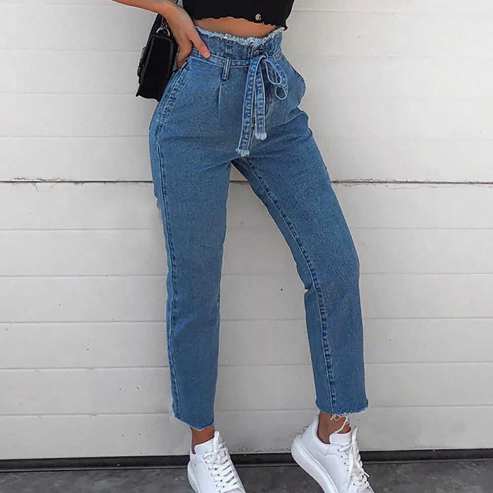 Брюки женские джинсовые с завышенной талией, модные облегающие штаны из денима с поясом, уличная одежда, большие размеры