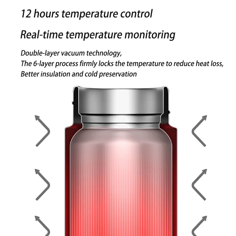 1. Интеллектуальный температурный дисплей: встроенный высокочувствительный датчик температуры, вам нужно только положить палец на крышку бутылки, и светодиодный дисплей будет отображать температуру в бутылке.
