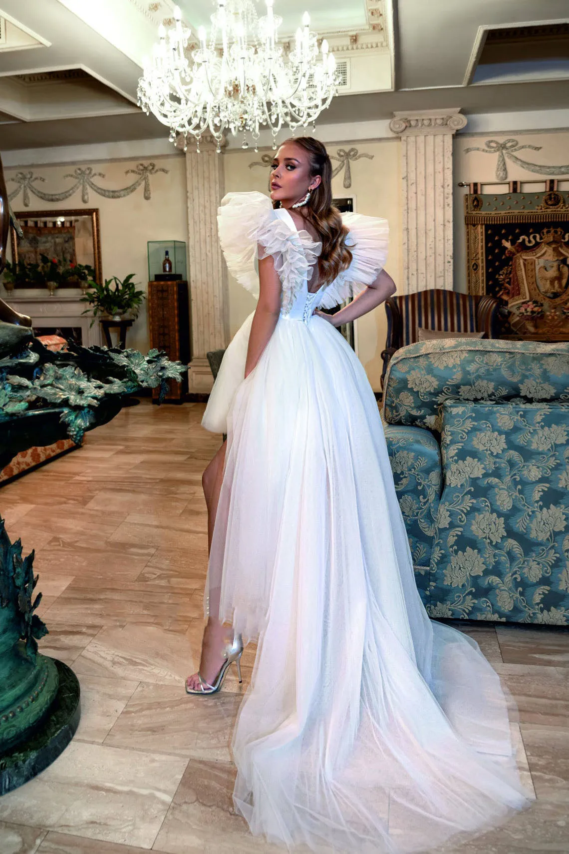 Белое Тюлевое свадебное платье с оборками и V-образным вырезом, сделанное на заказ короткое спереди длинное сзади платье для выпускного вечера, бальное платье с длинным шлейфом, Обручальное платье
