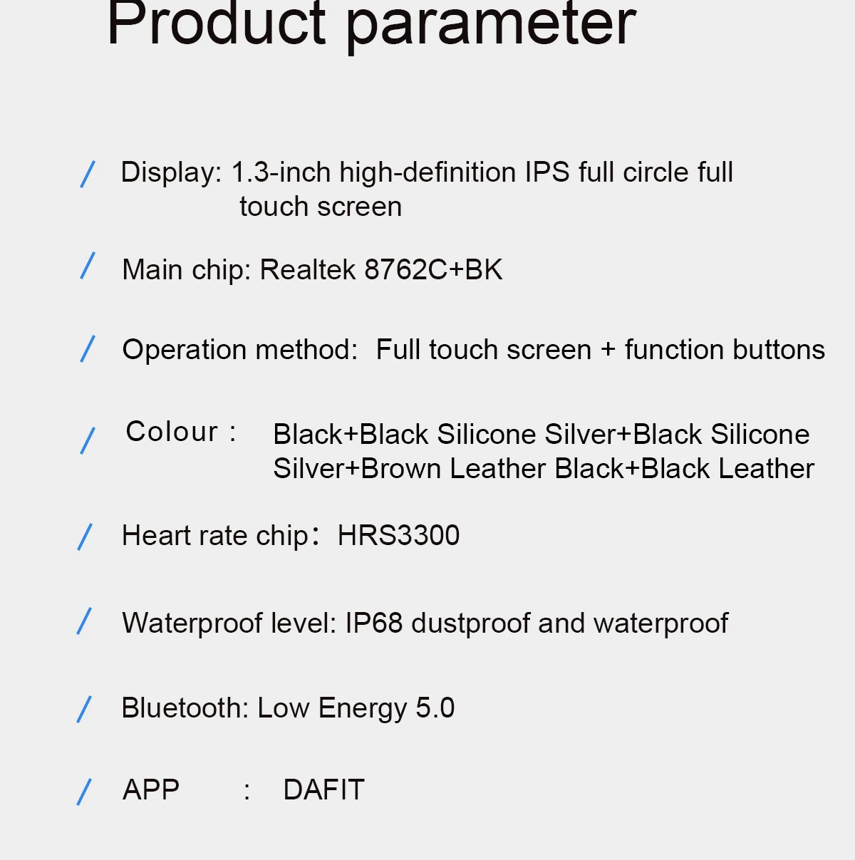 Параметры продуктаЭкран: 1,3 дюйма IPSСенсорная панель: сенсорный экран на весь экранАккумулятор: 230 мАчПриложение: Da FitСпособ зарядки: Прямая зарядка через USB-портВодонепроницаемость: IP68Параметр оборудованияВерсия Bluetooth: Bluetooth 5,0 (LE + Basic)Версия системы: Android выше 4,4 или IOS выше 9,0Функция программного обеспеченияШагомер/калории. Мониторинг сна. Вибромотор. Напоминание о тревоге. Вызов отклонен. Секундомер. Мультиспортивный режим (8 спортивных режимов, таких как ходьба, бег, плавание, бадминтон, футбол и т. д.). Напоминание о сидячем положении. Напоминание о звонке/SMS-напоминание. Другие нажатия (SMS, WeChat, QQ, Twitter, Facebook и т. д. 10 видов нажатий, все нажатия не являются обязательными). Динамический пульс (отображение и анализ динамической гистограммы сердечного ритма). WeChat sports. Удаленный выбор камеры. Выбор набора. Дистанционное управление музыкой (Управляйте проигрывателем телефона, чтобы приостановить предыдущую песню, следующую песню). Обновление воздуха.ЯзыкБраслет поддерживает языки: китайский, традиционный китайский, английский, немецкий, корейский, испанский, японский, французский, русский, арабский, украинскийПриложение (Da Fit) поддерживает языки: китайский, традиционный китайский, английский, корейский, немецкий, испанский, японский, французский, итальянский, русский, португальский, арабский, украинскийПосылка входитХост, зарядное устройство, ремешок на запястье, руководство, коробкаПосле получения часов, пожалуйста, сначала зарядите. Поскольку после длительного периода логистики часы разряжены. Перед использованием отсканируйте QR-код в руководстве, чтобы загрузить приложение и подключить его к часам с помощью приложения.