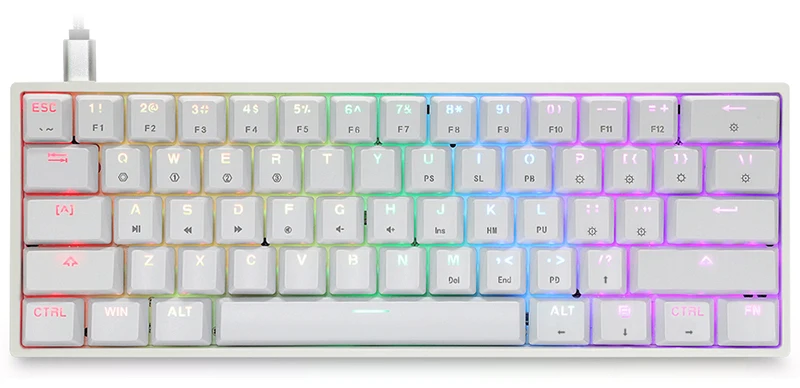 GK61: колпачки клавиш ABS/проводное подключение (USB Type C)GK61S: колпачки из АБС-пластика/проводное соединение (USB Type C) и беспроводное соединение bluetooth (FN + пробел может переключаться между проводным режимом и режимом Bluetooth, литиевая батарея 1900 мАч.)