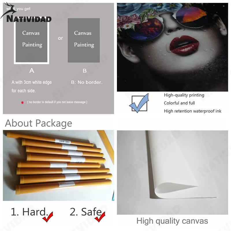 1. Наш материал напечатан чернилами, это водонепроницаемый холст2. По умолчаниюБез белого цветаГраницы, если вам это нужно, вы можете добавить белую границу в пределах 3 см бесплатно3. Что касается упаковки, мы используем различные методы упаковки для больших и маленьких штук.Маленькие размеры упакованы в конверты, а большие размеры используются в цилиндрической упаковке.4. Мы можем настроить фотографии, связаться со службой поддержки клиентов при необходимости и поддерживать связь в любое время
