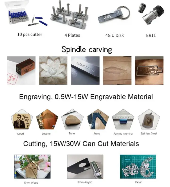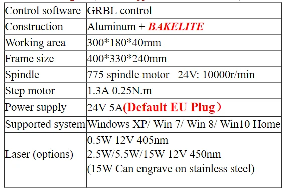 3018pro:Упаковка 1: 1 гравировальный станок + 1 ER11 + 10 резаков + 4 пластины + 1 U-диск 4GУпаковка 2: 1 гравировальный станок + 1 ER11 + 10 резаков + 4 пластины + лазер 500 МВт + 1 U-диск 4GУпаковка 3: 1 гравировальный станок + 1 ER11 + 10 резаков + 4 пластины + лазер 2500 мвт + 1 U-диск 4GУпаковка 4: 1 гравировальный станок + 1 ER11 + 10 резаков + 4 пластины + лазер 5500 МВт + 1 U-диск 4GУпаковка 5: 1 гравировальный станок + 1 ER11 + 10 резаков + 4 пластины + лазер 15000 МВт + 1 U-диск 4G3018pro офлайн:Упаковка 1.1 гравировальный станок + 1 ER11 + 10 резаков + 4 пластины + 1 автономное управление + 1 U-диск 4GУпаковка 2.2 1 гравировальный станок + 1 ER11 + 10 резаков + 4 пластины + 500 МВт лазер + 1 автономное управление + 1 U-диск 4GУпаковка 2500 1 гравировальный станок + 1 ER11 + 10 резаков + 4 пластины + лазер МВт + 1 автономное управление + 1 U-диск 4GPackage4.2 1 гравировальный станок + 1 ER11 + 10 резаков + 4 пластины + 5500 МВт лазер + 1 автономное управление + 1x4G U дискУпаковка 15000 1 гравировальный станок + 1 ER11 + 10 резаков + 4 пластины + лазер МВт + 1 автономное управление + 1 U-диск 4G