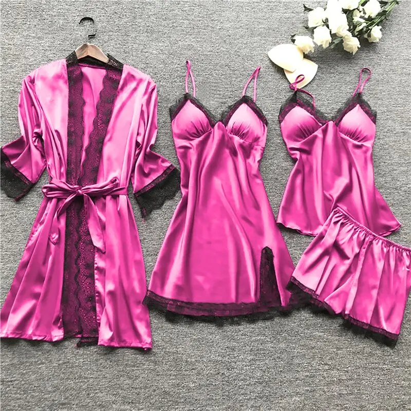 Комплект пижамный Женский, из 4 предметов, атласный, Шелковый, однотонный, кружевной, с подкладками на груди, 2021